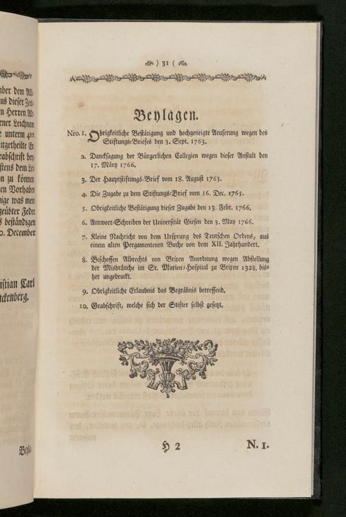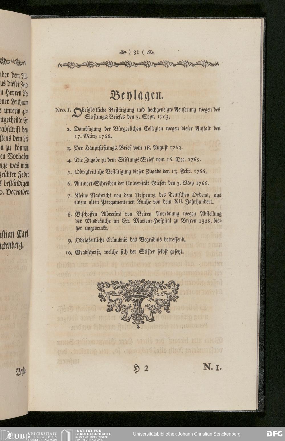 V48 Dr. Senckenbergische Stiftung, 233 - Stiftungsbrief: "Johann Christian Senckenberg Medicinae Doctoris und Physici Ordinarii zu Frankfurt Stiftungs-Briefe zum Besten der Artzneykunst und Armenpflege; Samt Nachricht wegen eines zu unternehmenden Buerger- und Beysassen-Hospitals zum Behufe der Stadt Frankfurt. Nebst Vorbericht Renat Leopold Christian Carl Freyherrn von Senckenberg; Mit Beylagen und zwoen Kupfer-Tabellen", Frankfurt a. M. 1770