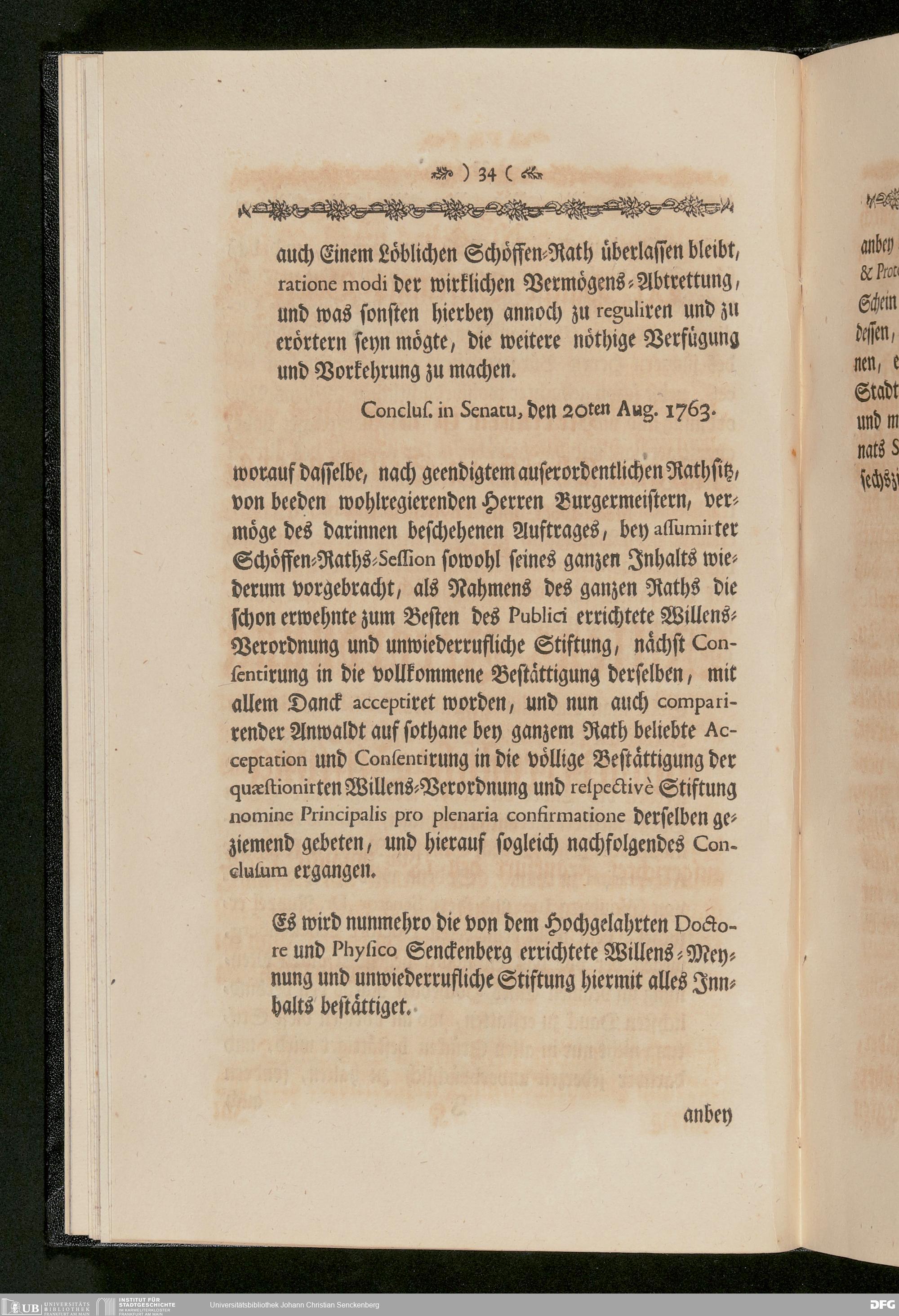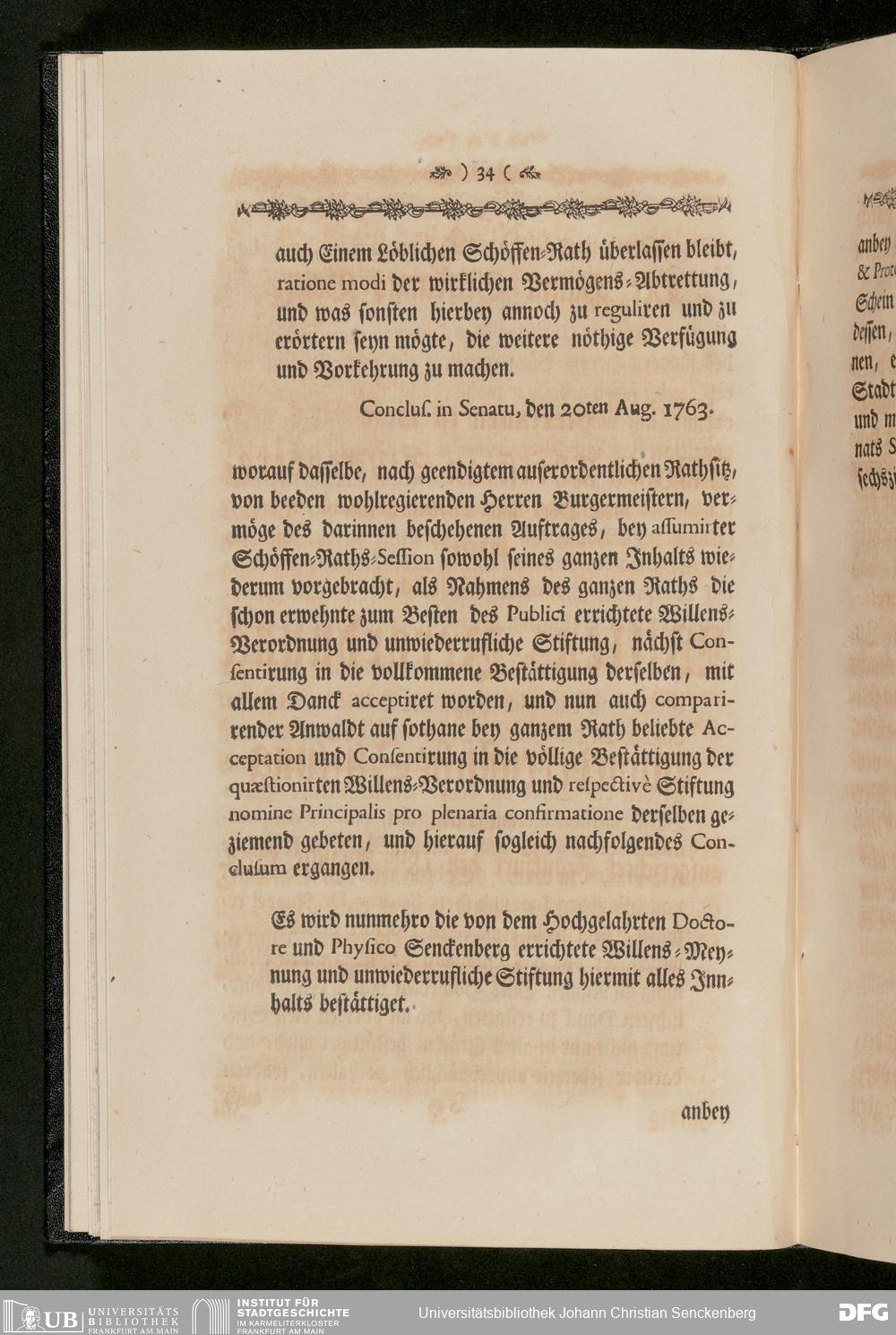 V48 Dr. Senckenbergische Stiftung, 233 - Stiftungsbrief: "Johann Christian Senckenberg Medicinae Doctoris und Physici Ordinarii zu Frankfurt Stiftungs-Briefe zum Besten der Artzneykunst und Armenpflege; Samt Nachricht wegen eines zu unternehmenden Buerger- und Beysassen-Hospitals zum Behufe der Stadt Frankfurt. Nebst Vorbericht Renat Leopold Christian Carl Freyherrn von Senckenberg; Mit Beylagen und zwoen Kupfer-Tabellen", Frankfurt a. M. 1770