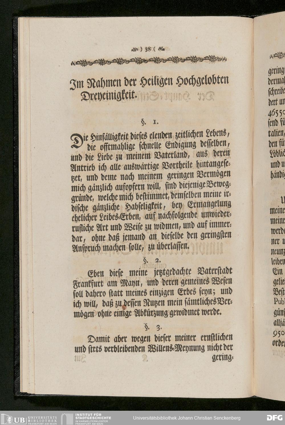 V48 Dr. Senckenbergische Stiftung, 233 - Stiftungsbrief: "Johann Christian Senckenberg Medicinae Doctoris und Physici Ordinarii zu Frankfurt Stiftungs-Briefe zum Besten der Artzneykunst und Armenpflege; Samt Nachricht wegen eines zu unternehmenden Buerger- und Beysassen-Hospitals zum Behufe der Stadt Frankfurt. Nebst Vorbericht Renat Leopold Christian Carl Freyherrn von Senckenberg; Mit Beylagen und zwoen Kupfer-Tabellen", Frankfurt a. M. 1770