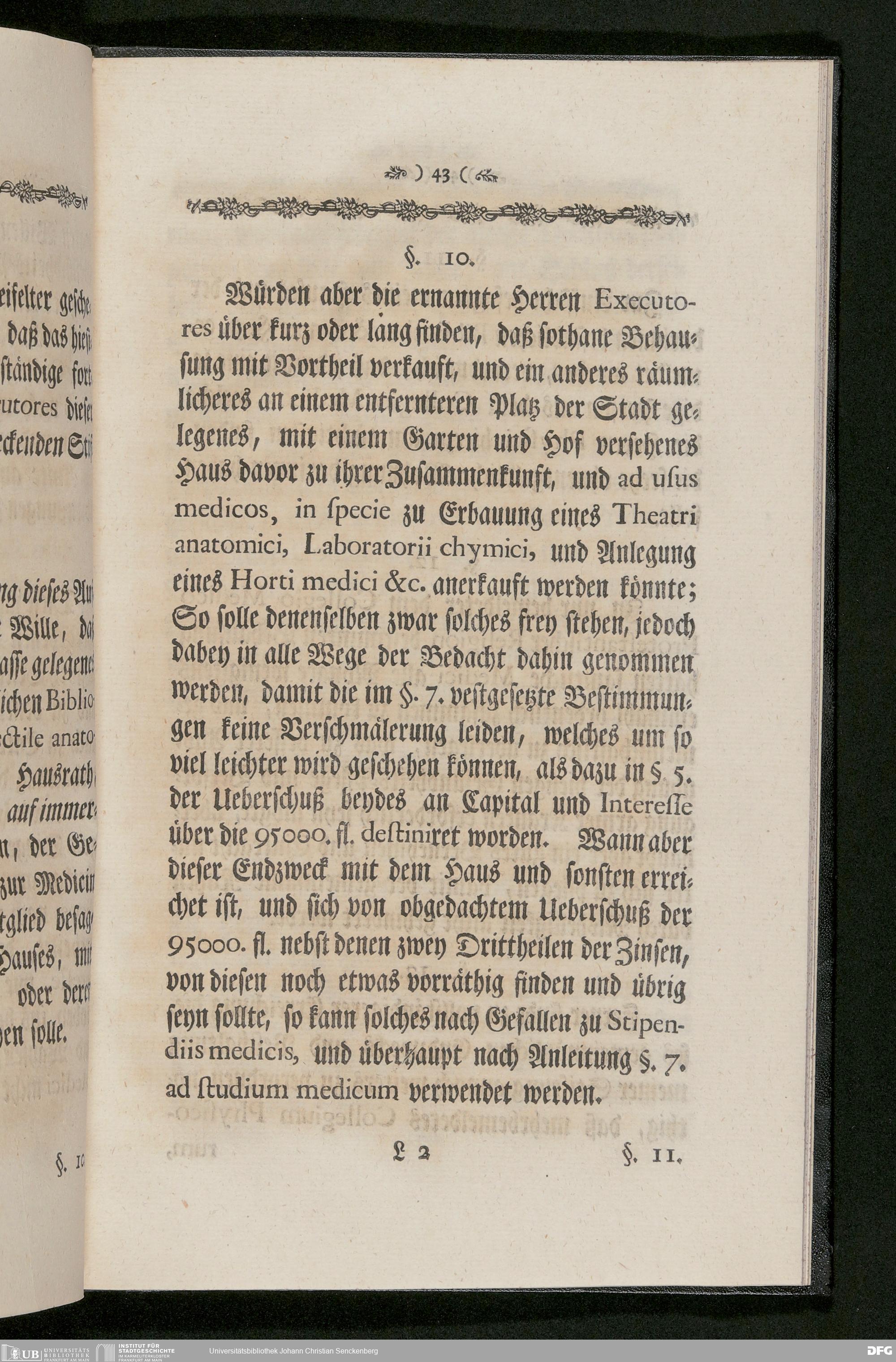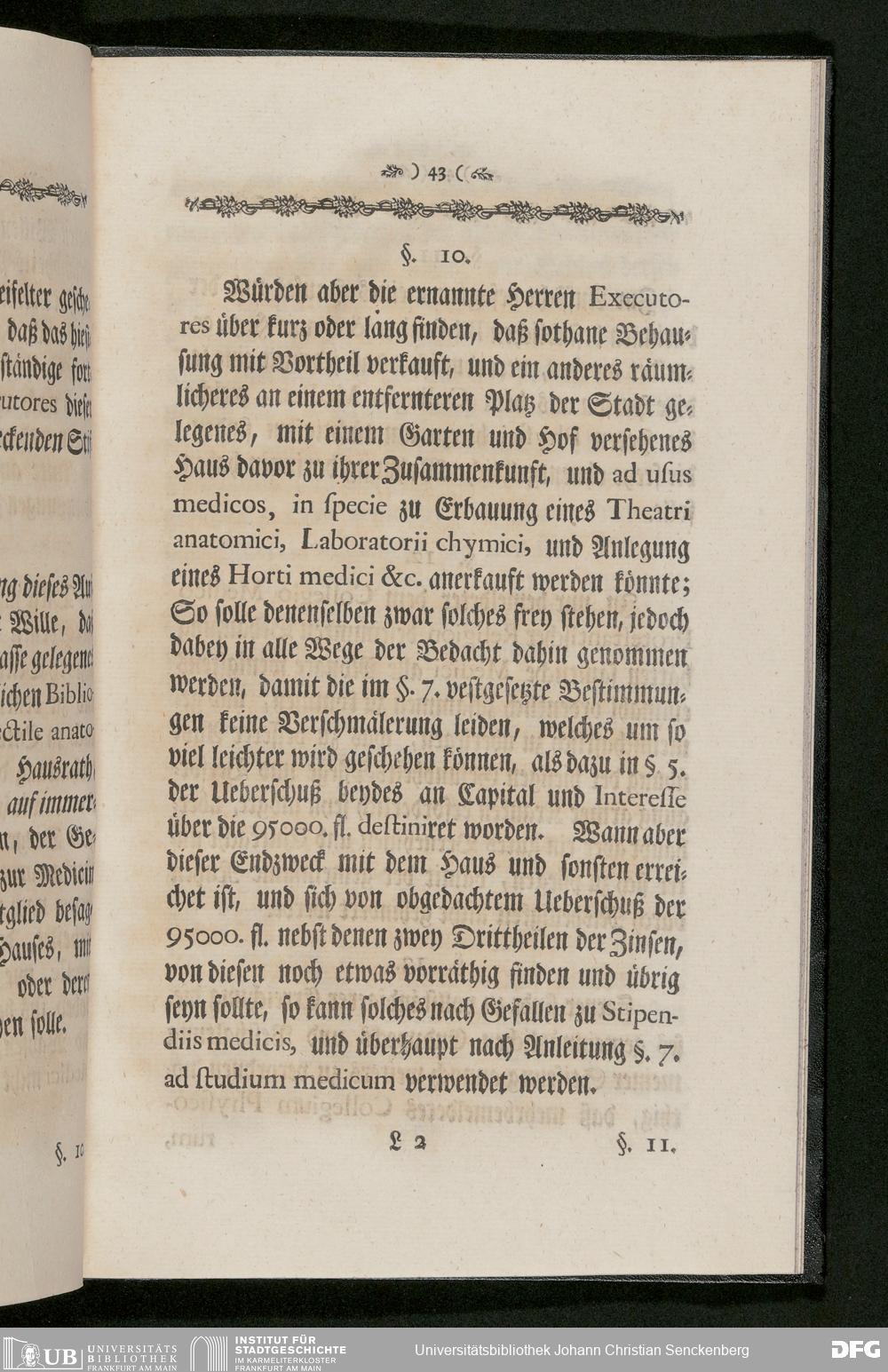 V48 Dr. Senckenbergische Stiftung, 233 - Stiftungsbrief: "Johann Christian Senckenberg Medicinae Doctoris und Physici Ordinarii zu Frankfurt Stiftungs-Briefe zum Besten der Artzneykunst und Armenpflege; Samt Nachricht wegen eines zu unternehmenden Buerger- und Beysassen-Hospitals zum Behufe der Stadt Frankfurt. Nebst Vorbericht Renat Leopold Christian Carl Freyherrn von Senckenberg; Mit Beylagen und zwoen Kupfer-Tabellen", Frankfurt a. M. 1770