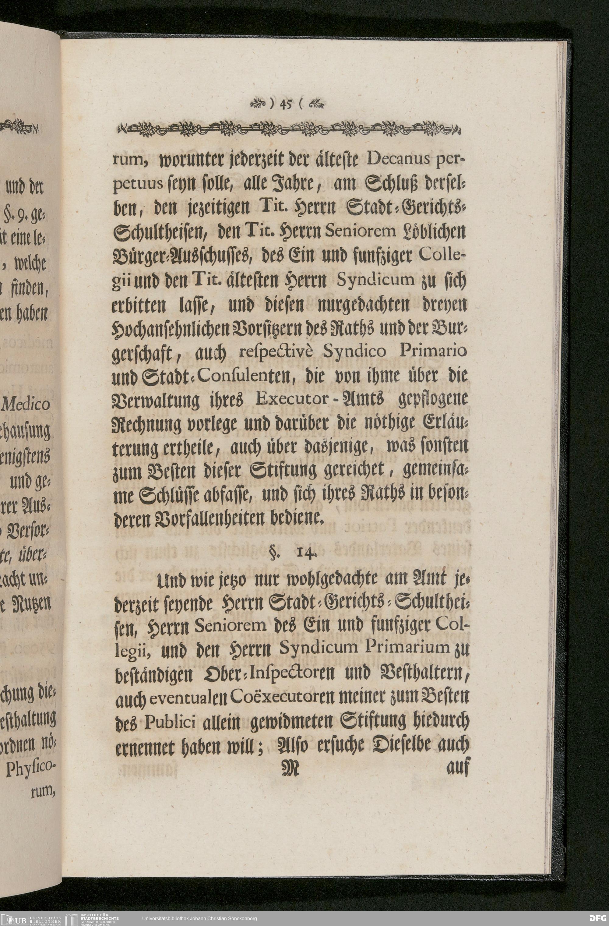 V48 Dr. Senckenbergische Stiftung, 233 - Stiftungsbrief: "Johann Christian Senckenberg Medicinae Doctoris und Physici Ordinarii zu Frankfurt Stiftungs-Briefe zum Besten der Artzneykunst und Armenpflege; Samt Nachricht wegen eines zu unternehmenden Buerger- und Beysassen-Hospitals zum Behufe der Stadt Frankfurt. Nebst Vorbericht Renat Leopold Christian Carl Freyherrn von Senckenberg; Mit Beylagen und zwoen Kupfer-Tabellen", Frankfurt a. M. 1770