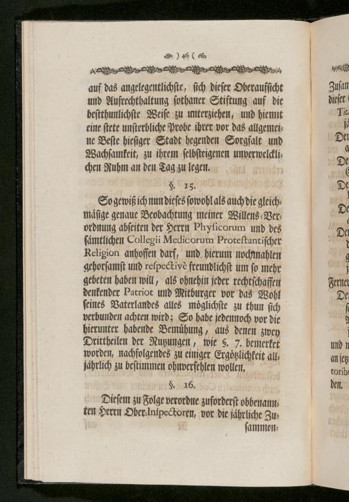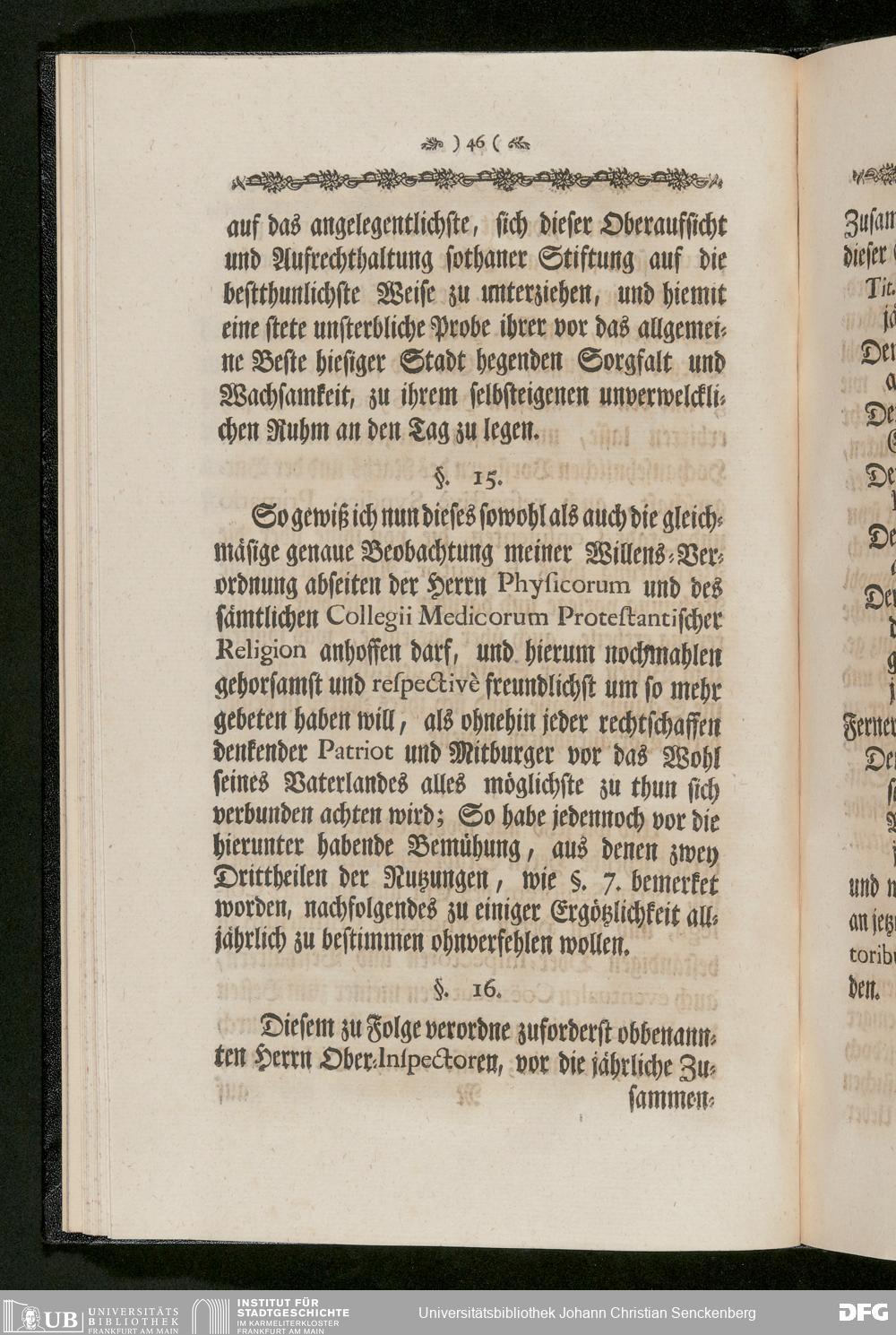 V48 Dr. Senckenbergische Stiftung, 233 - Stiftungsbrief: "Johann Christian Senckenberg Medicinae Doctoris und Physici Ordinarii zu Frankfurt Stiftungs-Briefe zum Besten der Artzneykunst und Armenpflege; Samt Nachricht wegen eines zu unternehmenden Buerger- und Beysassen-Hospitals zum Behufe der Stadt Frankfurt. Nebst Vorbericht Renat Leopold Christian Carl Freyherrn von Senckenberg; Mit Beylagen und zwoen Kupfer-Tabellen", Frankfurt a. M. 1770