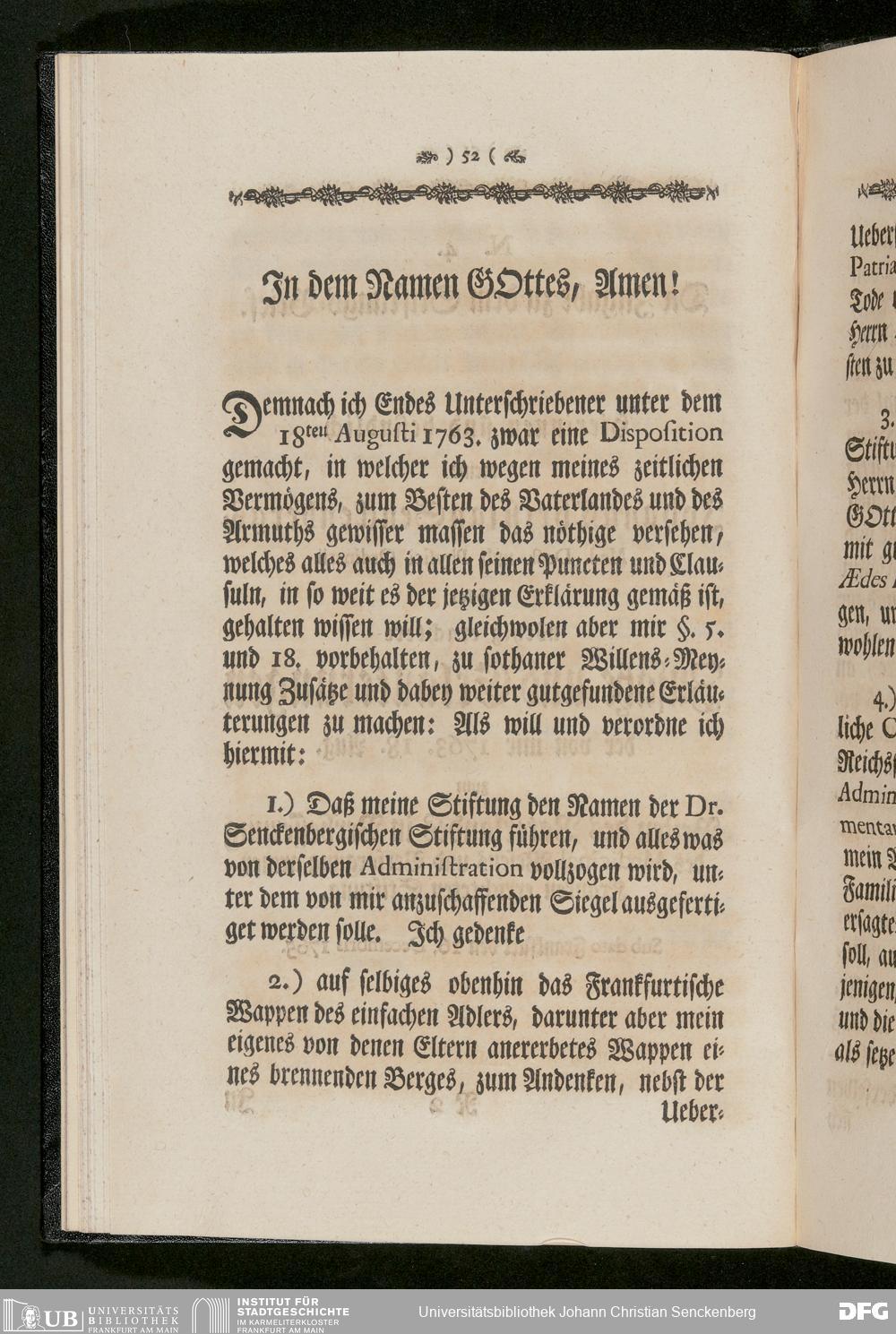 V48 Dr. Senckenbergische Stiftung, 233 - Stiftungsbrief: "Johann Christian Senckenberg Medicinae Doctoris und Physici Ordinarii zu Frankfurt Stiftungs-Briefe zum Besten der Artzneykunst und Armenpflege; Samt Nachricht wegen eines zu unternehmenden Buerger- und Beysassen-Hospitals zum Behufe der Stadt Frankfurt. Nebst Vorbericht Renat Leopold Christian Carl Freyherrn von Senckenberg; Mit Beylagen und zwoen Kupfer-Tabellen", Frankfurt a. M. 1770