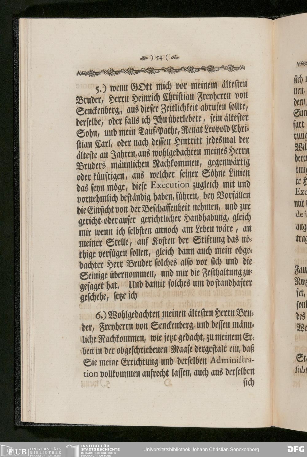 V48 Dr. Senckenbergische Stiftung, 233 - Stiftungsbrief: "Johann Christian Senckenberg Medicinae Doctoris und Physici Ordinarii zu Frankfurt Stiftungs-Briefe zum Besten der Artzneykunst und Armenpflege; Samt Nachricht wegen eines zu unternehmenden Buerger- und Beysassen-Hospitals zum Behufe der Stadt Frankfurt. Nebst Vorbericht Renat Leopold Christian Carl Freyherrn von Senckenberg; Mit Beylagen und zwoen Kupfer-Tabellen", Frankfurt a. M. 1770