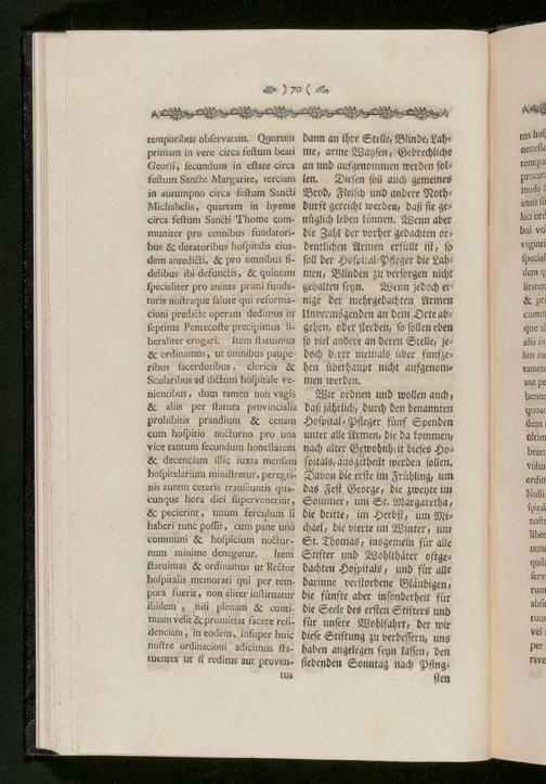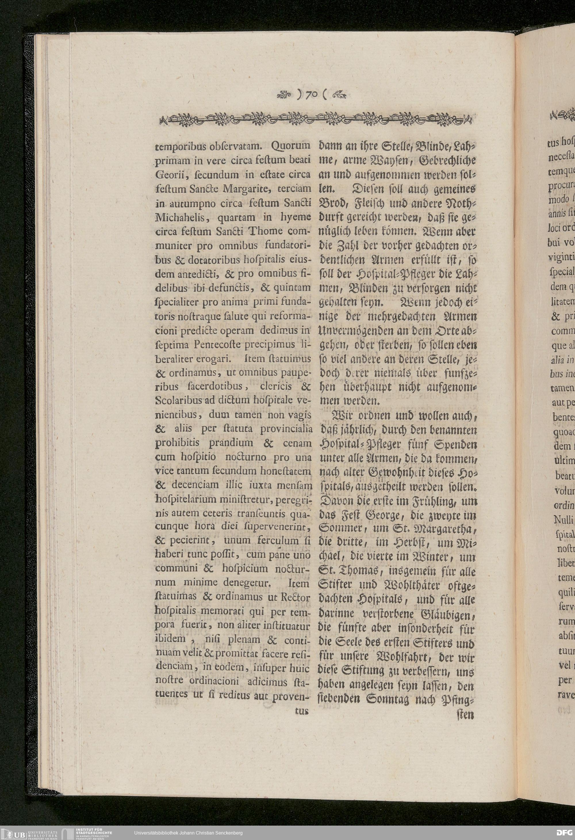 V48 Dr. Senckenbergische Stiftung, 233 - Stiftungsbrief: "Johann Christian Senckenberg Medicinae Doctoris und Physici Ordinarii zu Frankfurt Stiftungs-Briefe zum Besten der Artzneykunst und Armenpflege; Samt Nachricht wegen eines zu unternehmenden Buerger- und Beysassen-Hospitals zum Behufe der Stadt Frankfurt. Nebst Vorbericht Renat Leopold Christian Carl Freyherrn von Senckenberg; Mit Beylagen und zwoen Kupfer-Tabellen", Frankfurt a. M. 1770