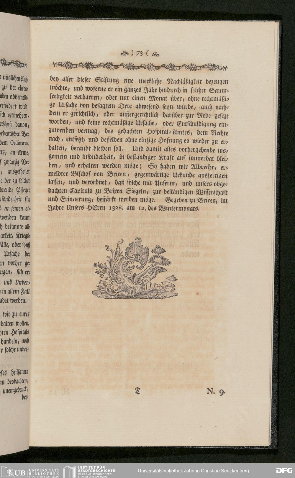 V48 Dr. Senckenbergische Stiftung, 233 - Stiftungsbrief: "Johann Christian Senckenberg Medicinae Doctoris und Physici Ordinarii zu Frankfurt Stiftungs-Briefe zum Besten der Artzneykunst und Armenpflege; Samt Nachricht wegen eines zu unternehmenden Buerger- und Beysassen-Hospitals zum Behufe der Stadt Frankfurt. Nebst Vorbericht Renat Leopold Christian Carl Freyherrn von Senckenberg; Mit Beylagen und zwoen Kupfer-Tabellen", Frankfurt a. M. 1770