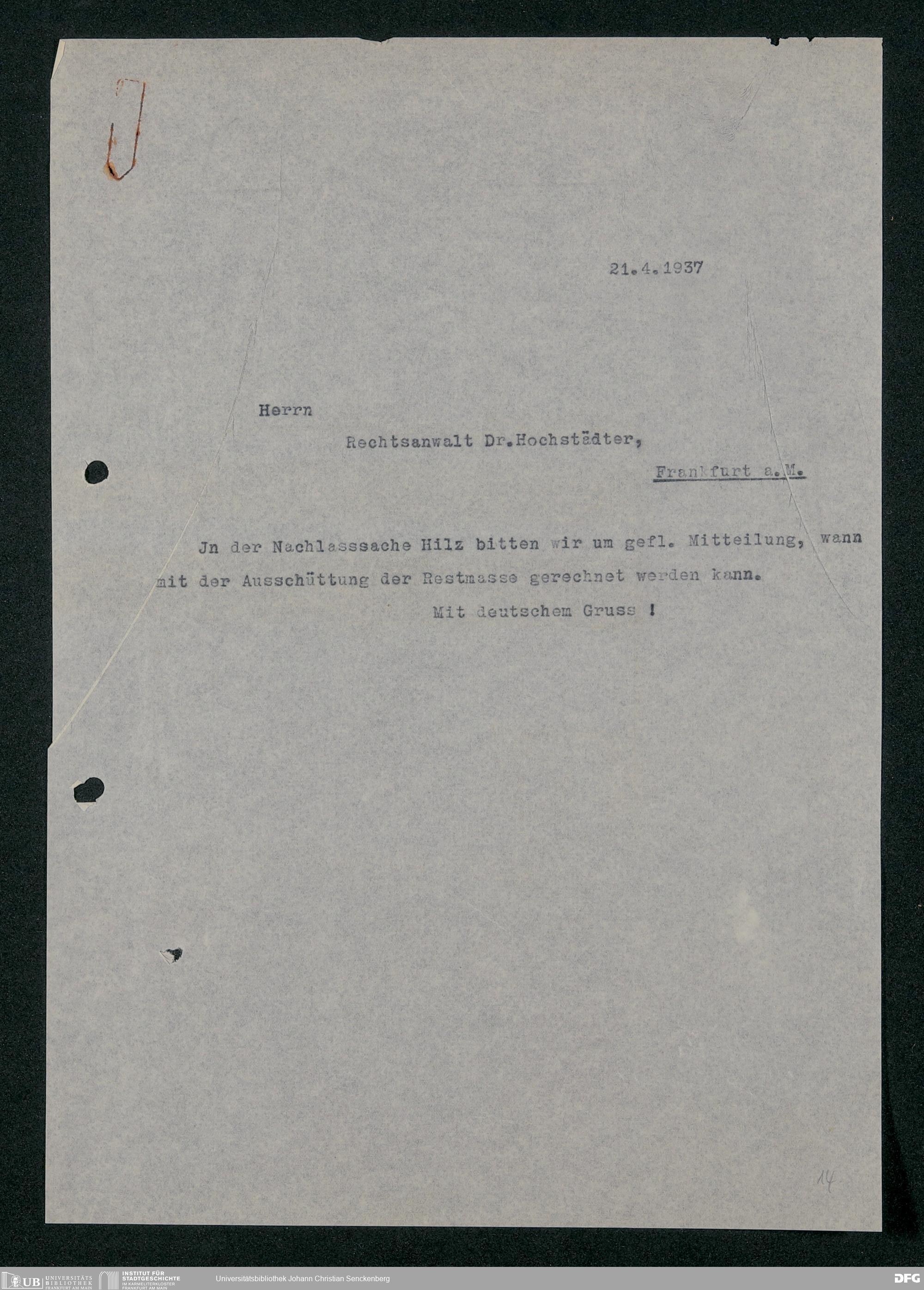 V48 Dr. Senckenbergische Stiftung, 317 - Nachlässe Hilz und Fritsch
