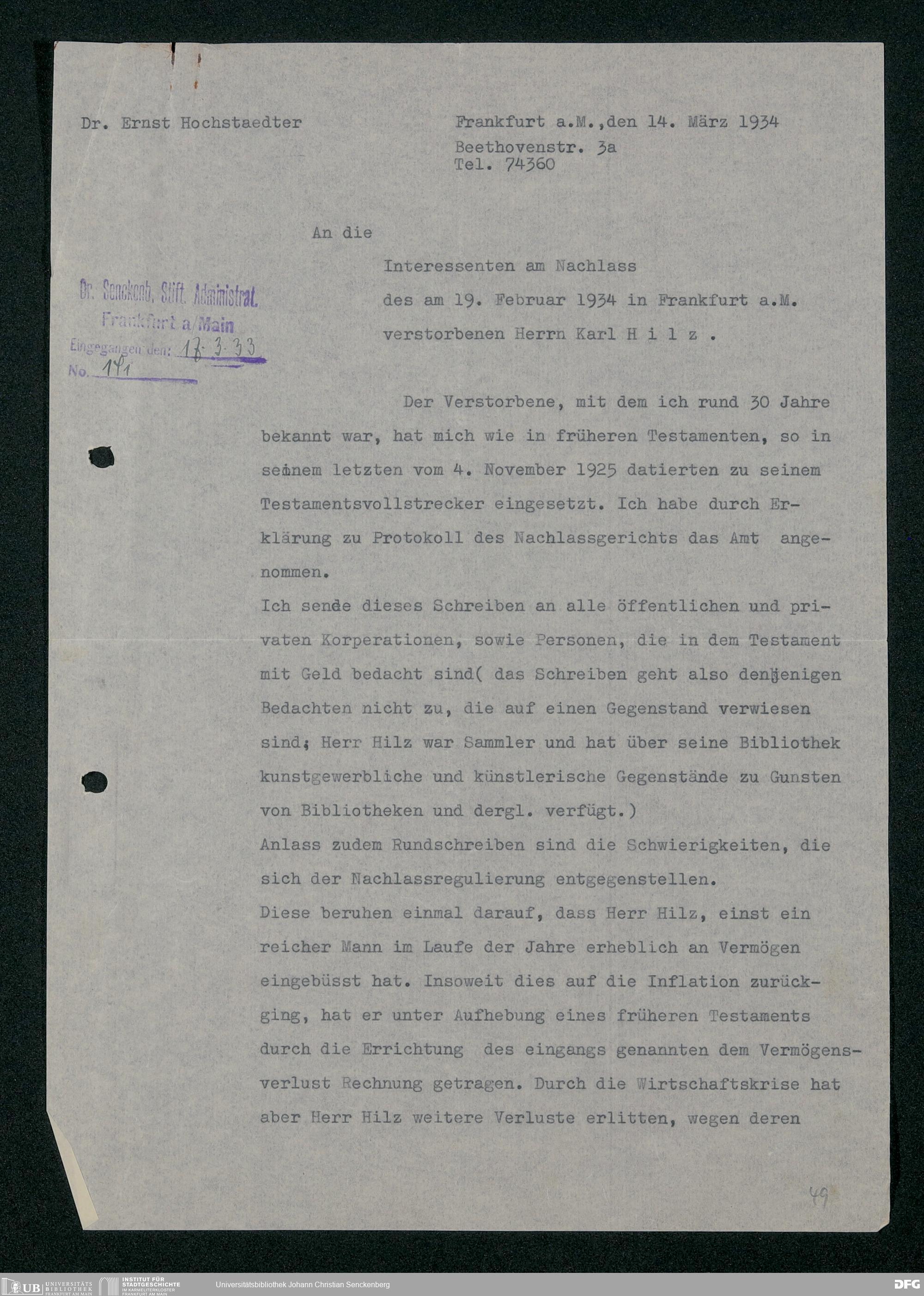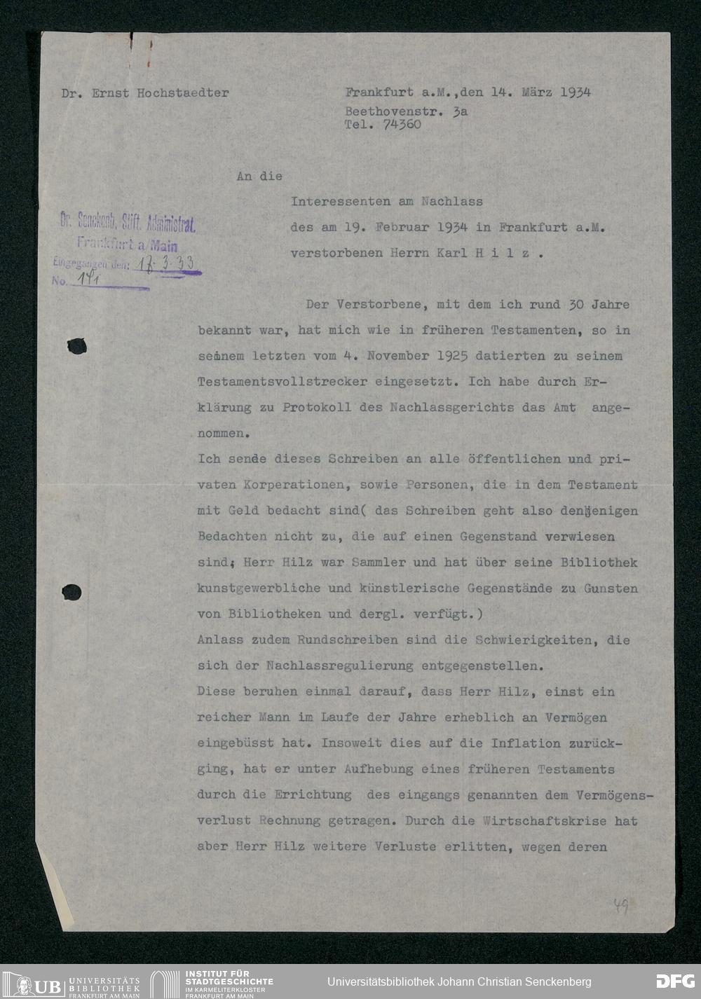 V48 Dr. Senckenbergische Stiftung, 317 - Nachlässe Hilz und Fritsch