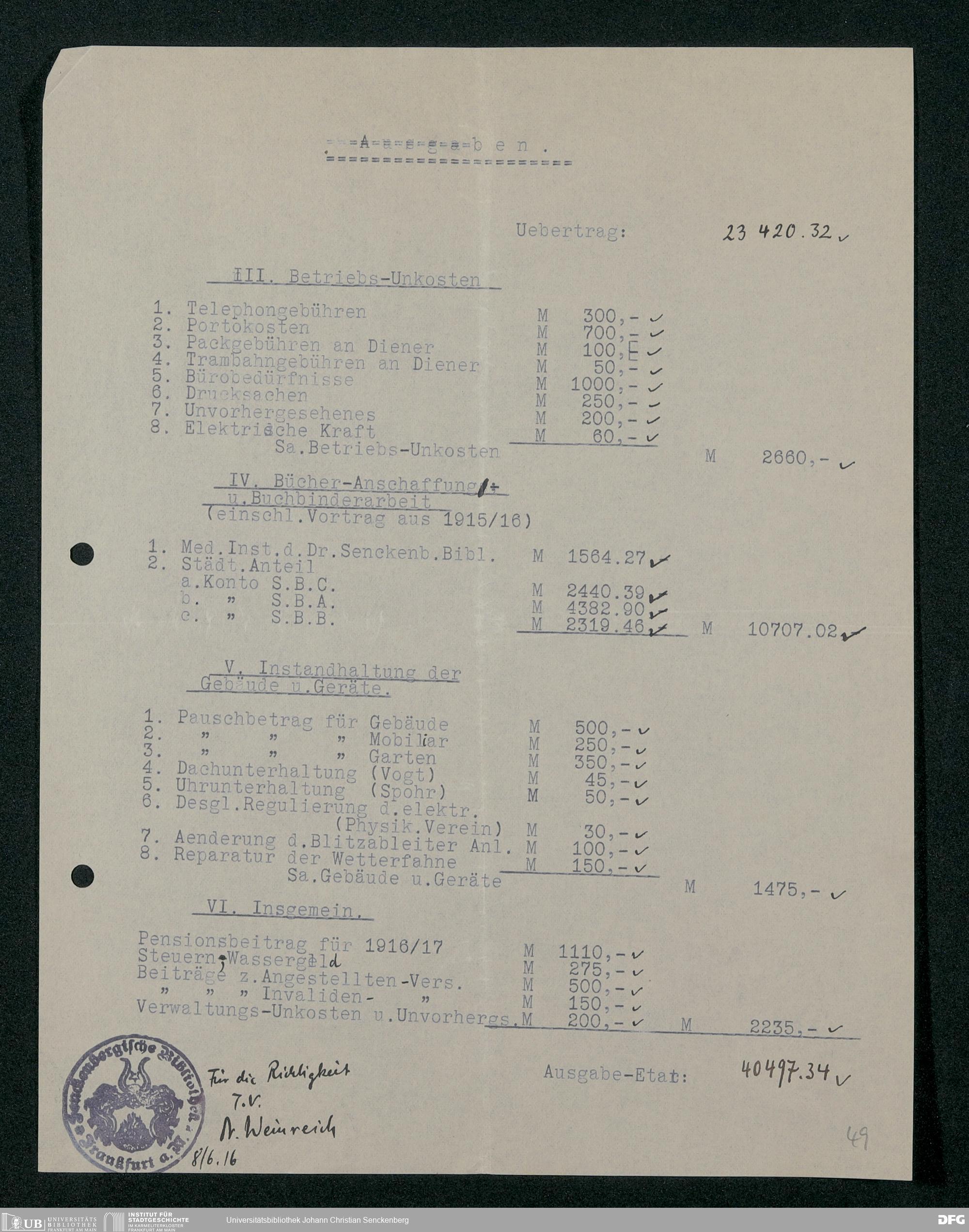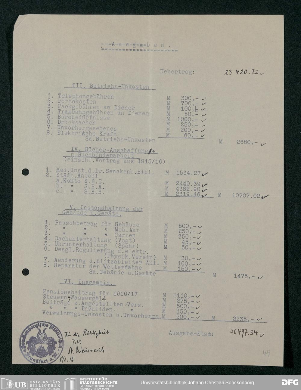 V48 Dr. Senckenbergische Stiftung, 321 - Verschiedene Bibliotheksangelegenheiten