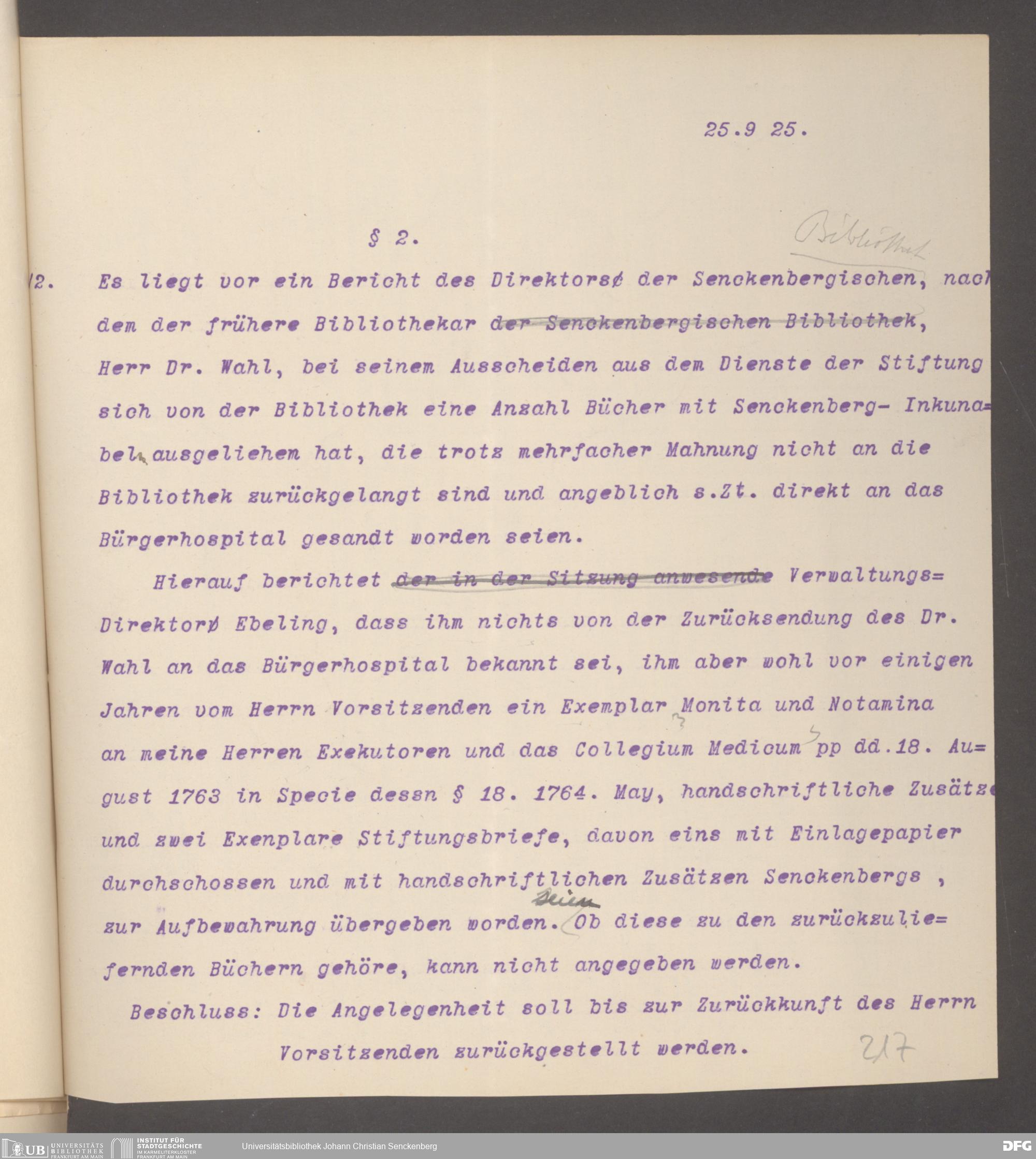 V48 Dr. Senckenbergische Stiftung, 325 - Bibliothek