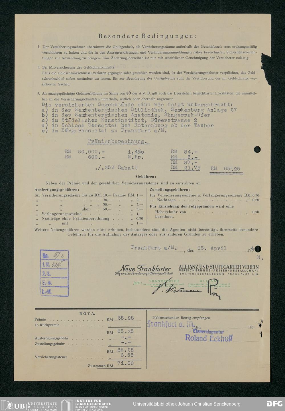 V48 Dr. Senckenbergische Stiftung, 331 - Versicherung der Gemäldesammlung