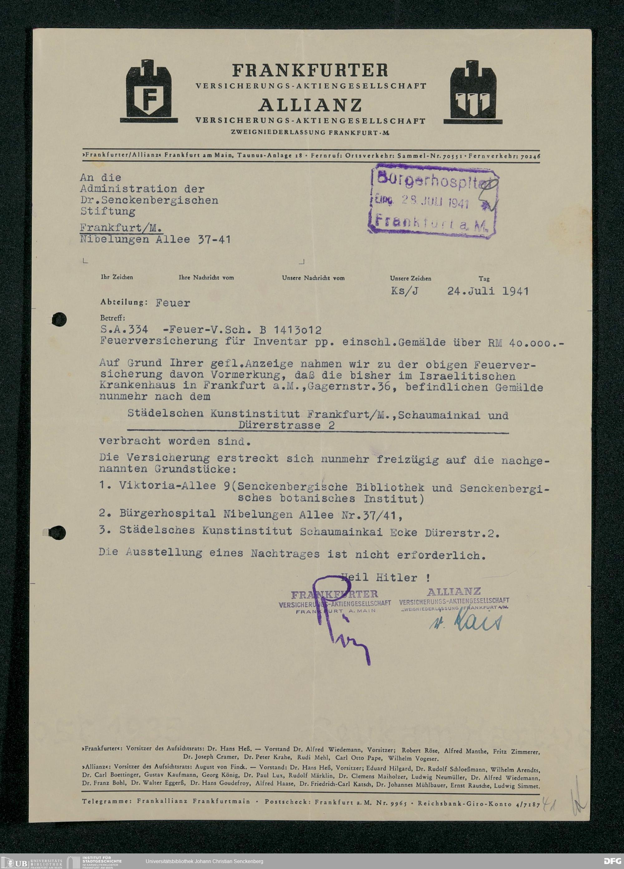 V48 Dr. Senckenbergische Stiftung, 331 - Versicherung der Gemäldesammlung