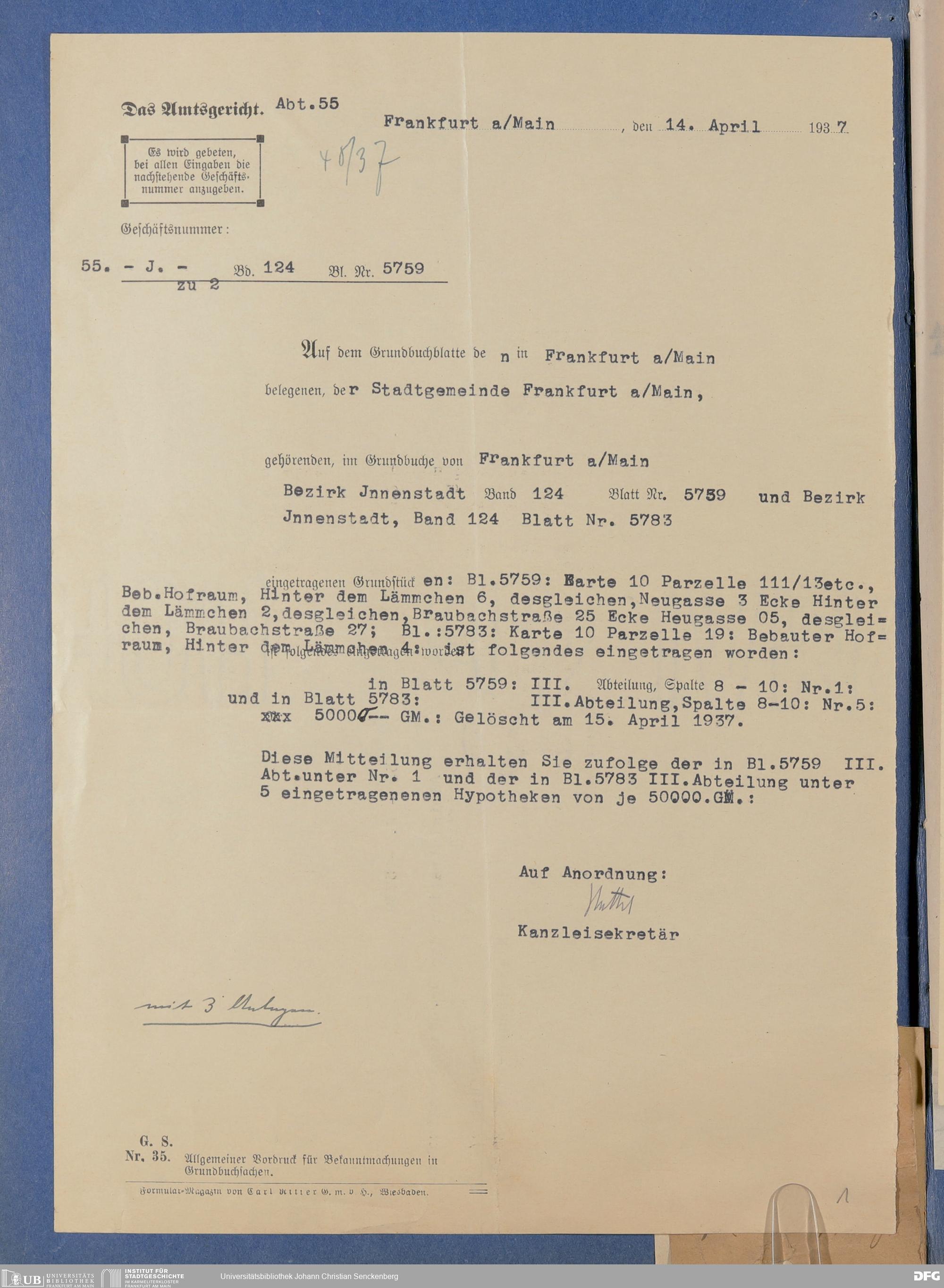 V48 Dr. Senckenbergische Stiftung, 348 - Hypotheken auf den Liegenschaften Braubachstraße 25 und 27, Hinter dem Lämmchen 2, 4 und 6 sowie Neugasse 3 und 5