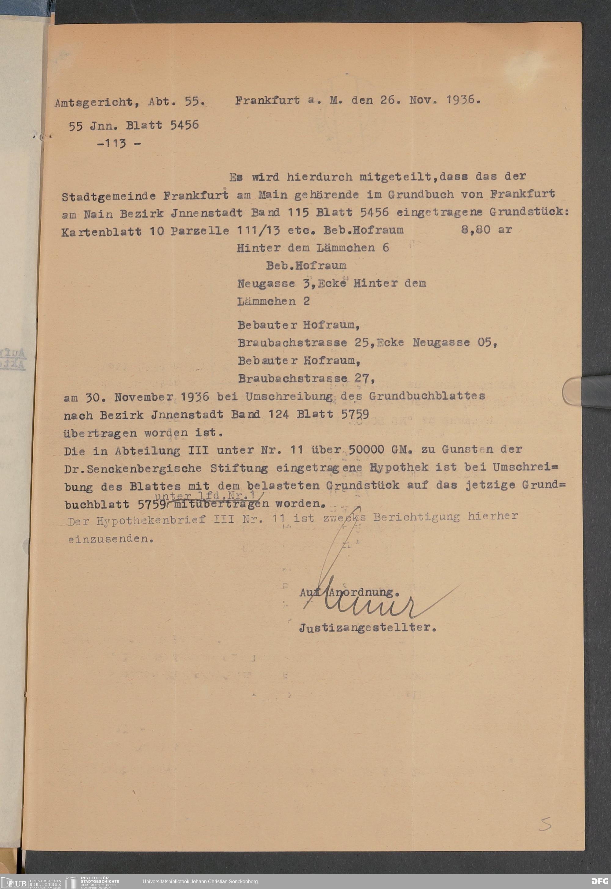 V48 Dr. Senckenbergische Stiftung, 348 - Hypotheken auf den Liegenschaften Braubachstraße 25 und 27, Hinter dem Lämmchen 2, 4 und 6 sowie Neugasse 3 und 5