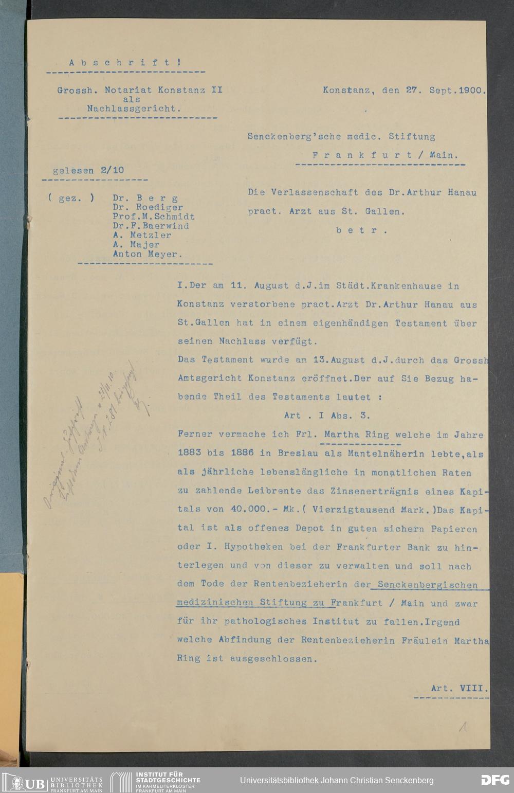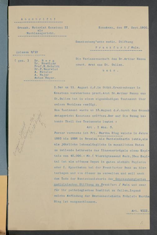 V48 Dr. Senckenbergische Stiftung, 378 - Vermächtnis von Dr. med. Arthur Hanau für das Senckenbergische Pathologische Institut