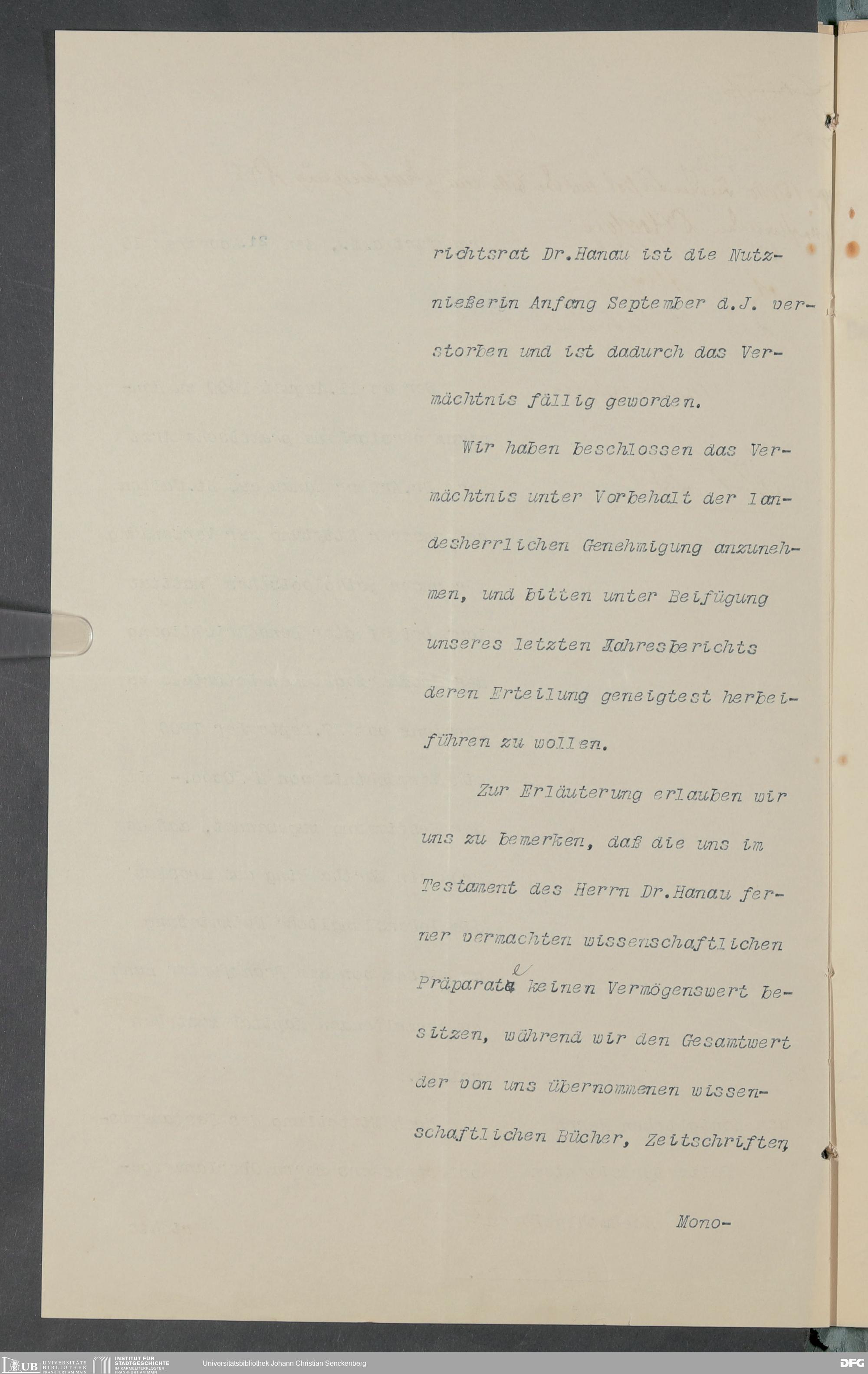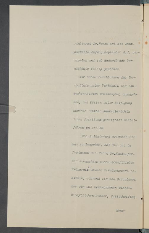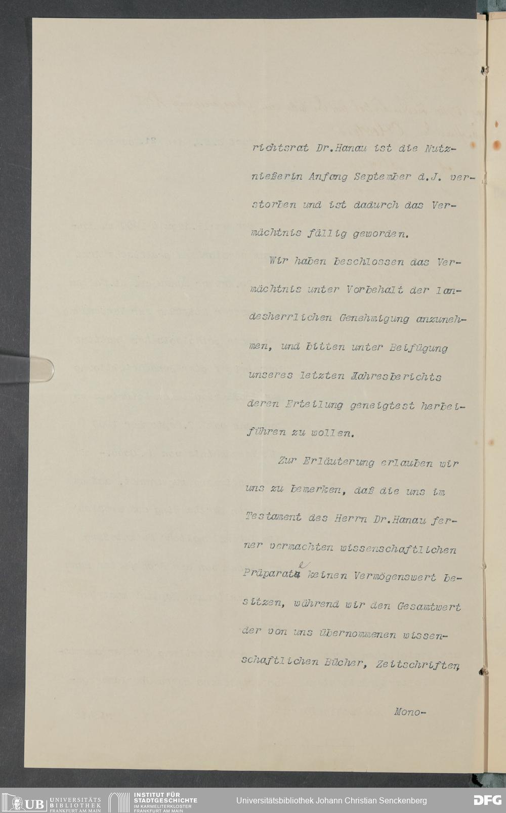 V48 Dr. Senckenbergische Stiftung, 378 - Vermächtnis von Dr. med. Arthur Hanau für das Senckenbergische Pathologische Institut