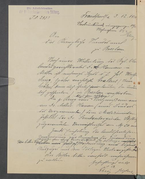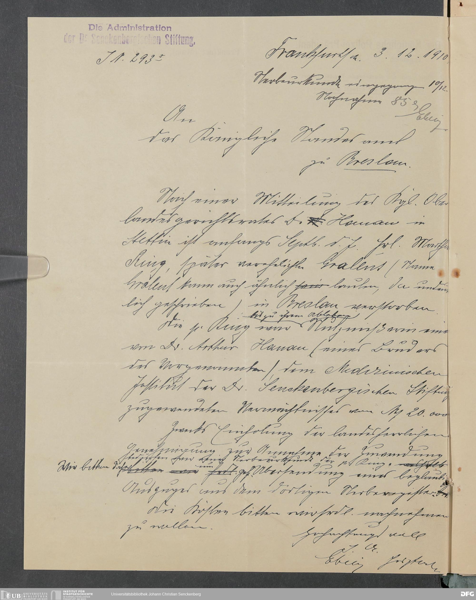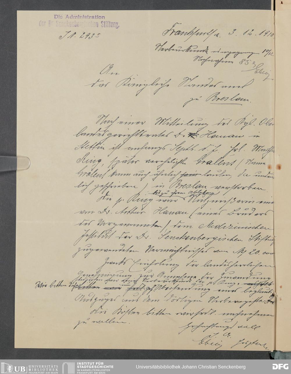 V48 Dr. Senckenbergische Stiftung, 378 - Vermächtnis von Dr. med. Arthur Hanau für das Senckenbergische Pathologische Institut