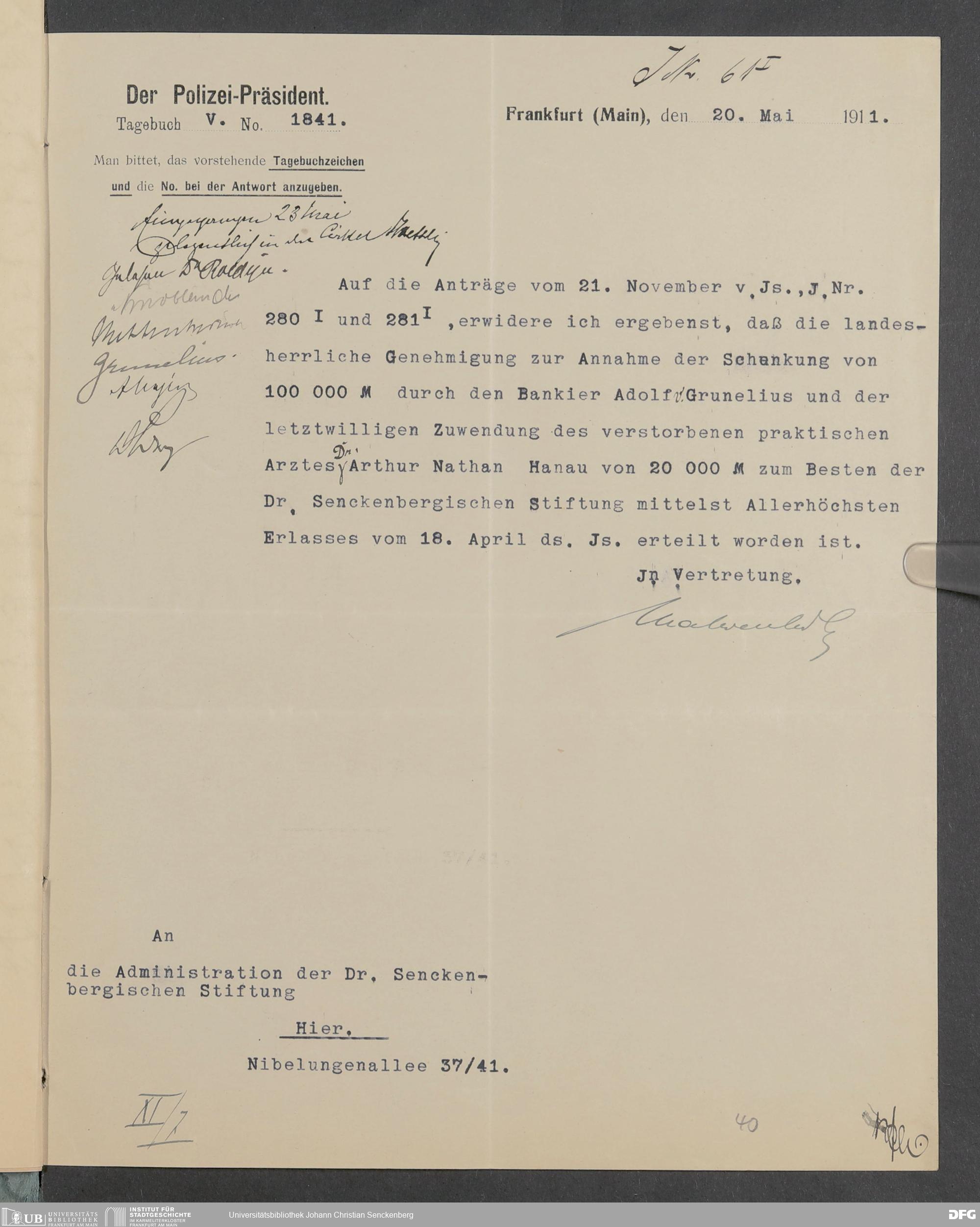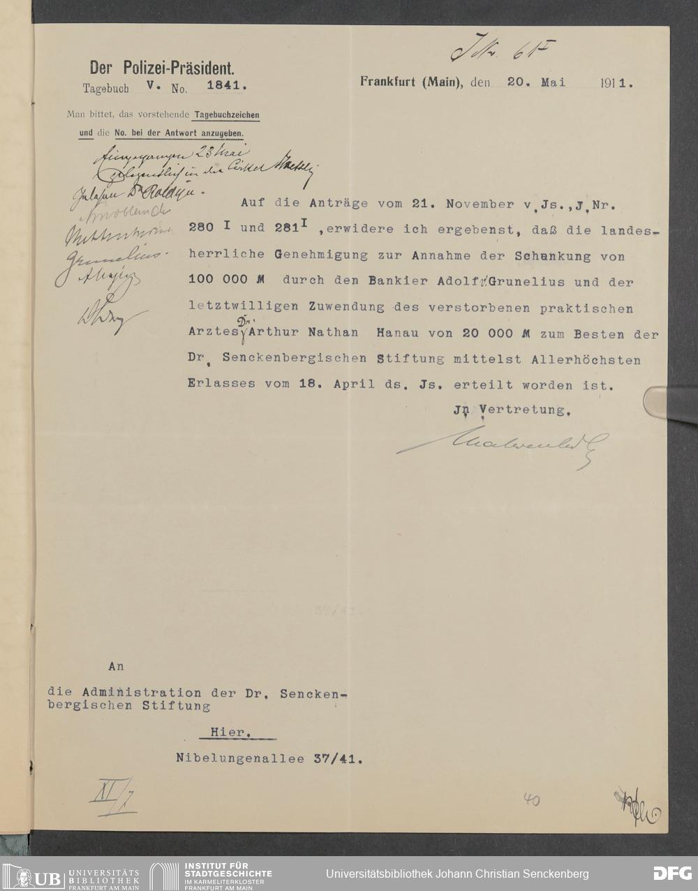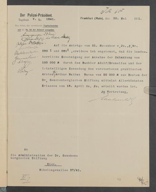 V48 Dr. Senckenbergische Stiftung, 378 - Vermächtnis von Dr. med. Arthur Hanau für das Senckenbergische Pathologische Institut