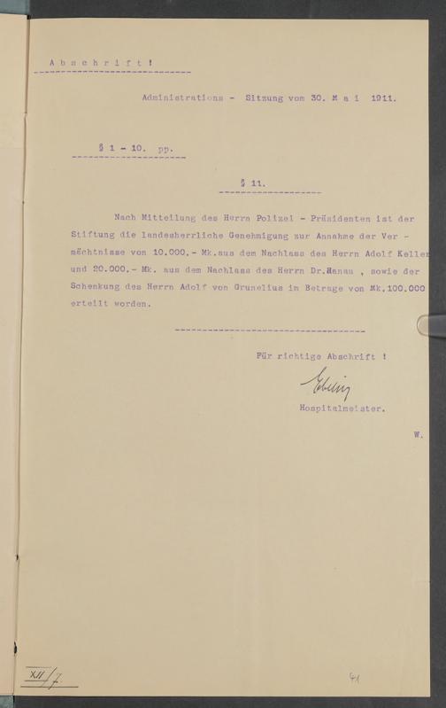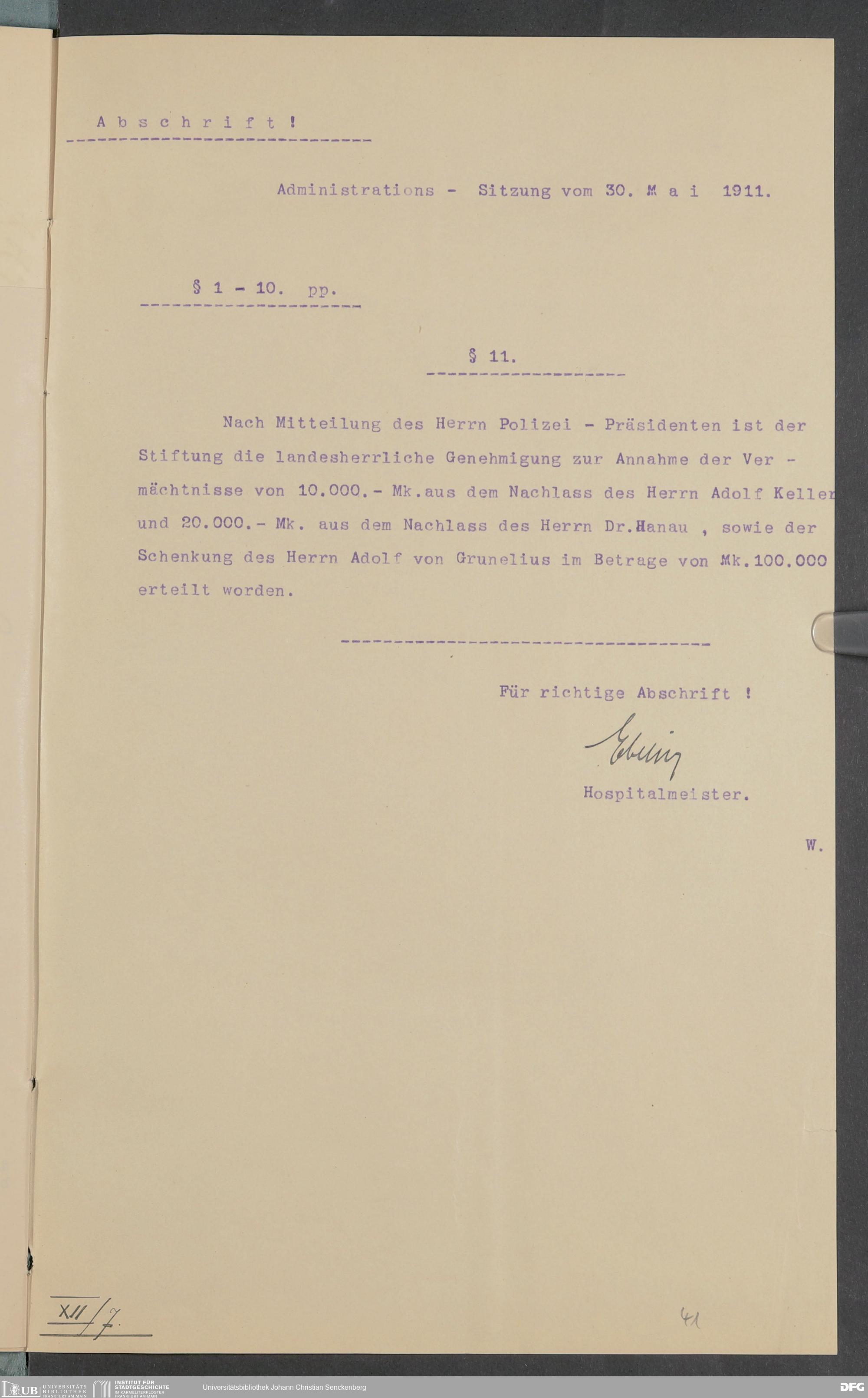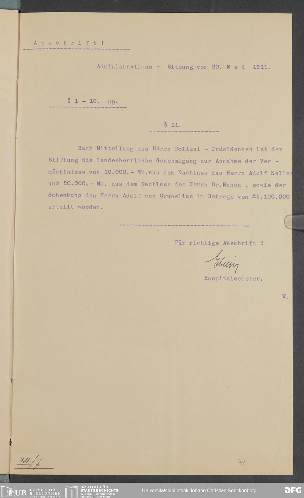 V48 Dr. Senckenbergische Stiftung, 378 - Vermächtnis von Dr. med. Arthur Hanau für das Senckenbergische Pathologische Institut