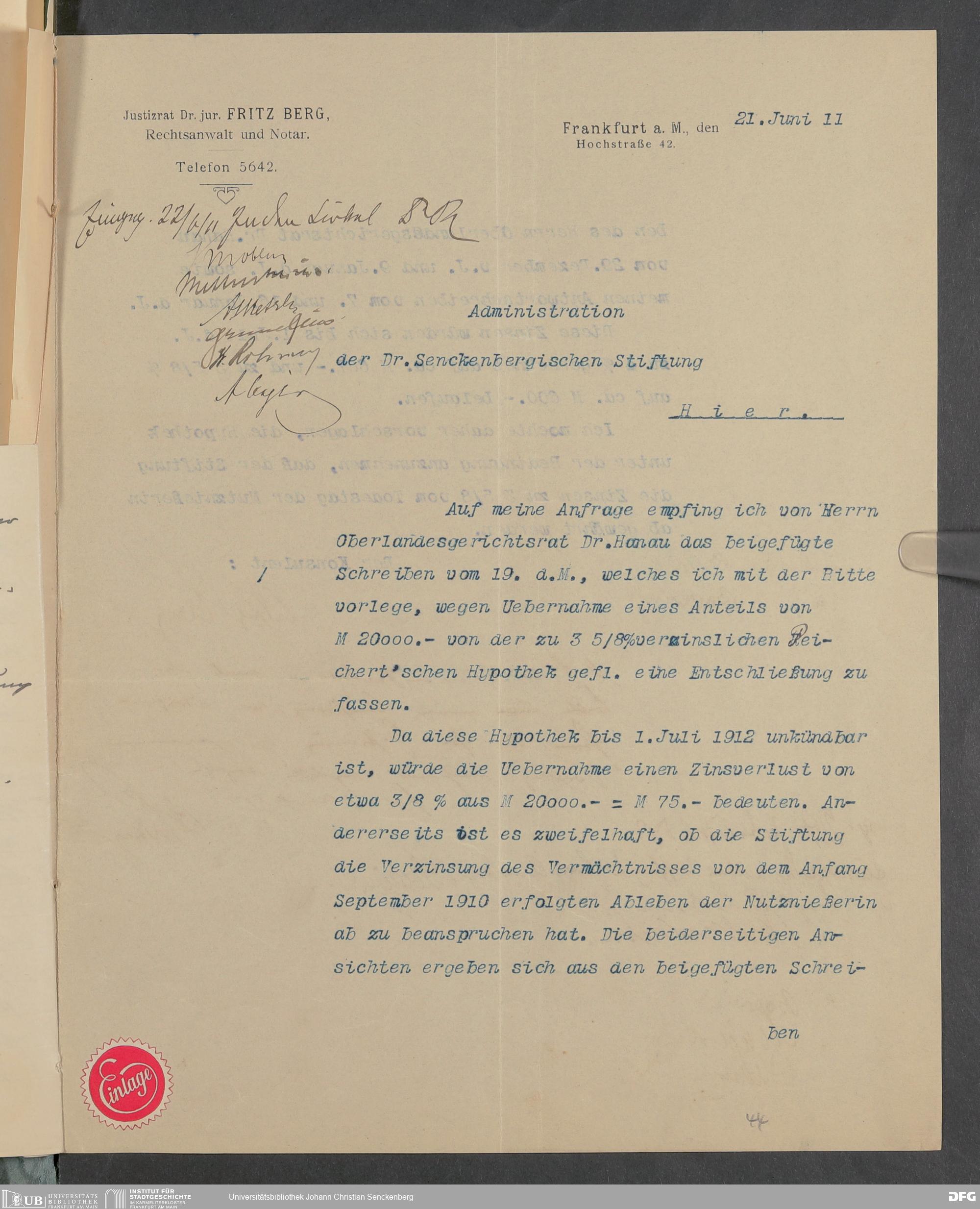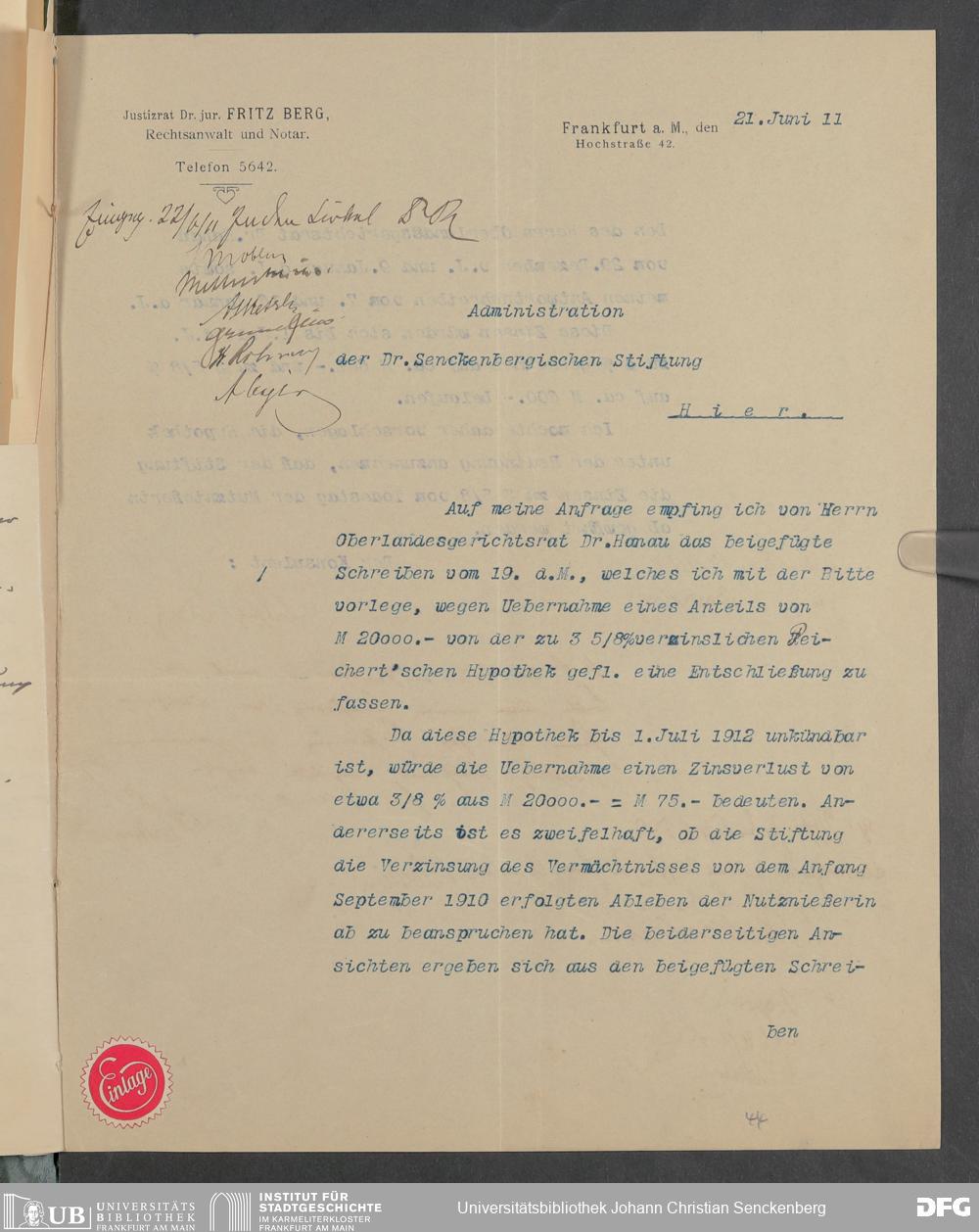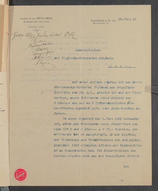 V48 Dr. Senckenbergische Stiftung, 378 - Vermächtnis von Dr. med. Arthur Hanau für das Senckenbergische Pathologische Institut