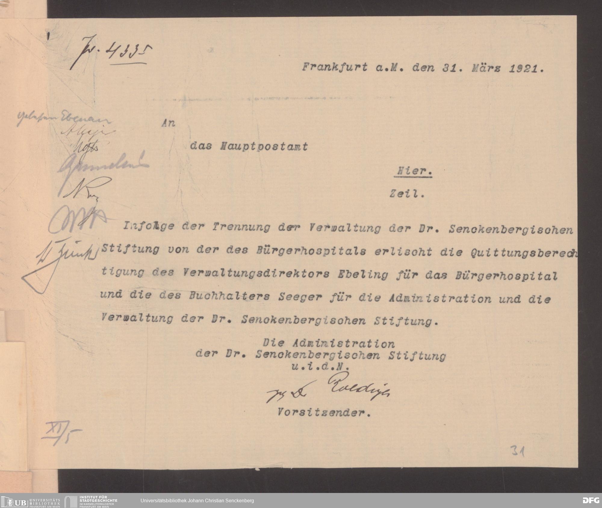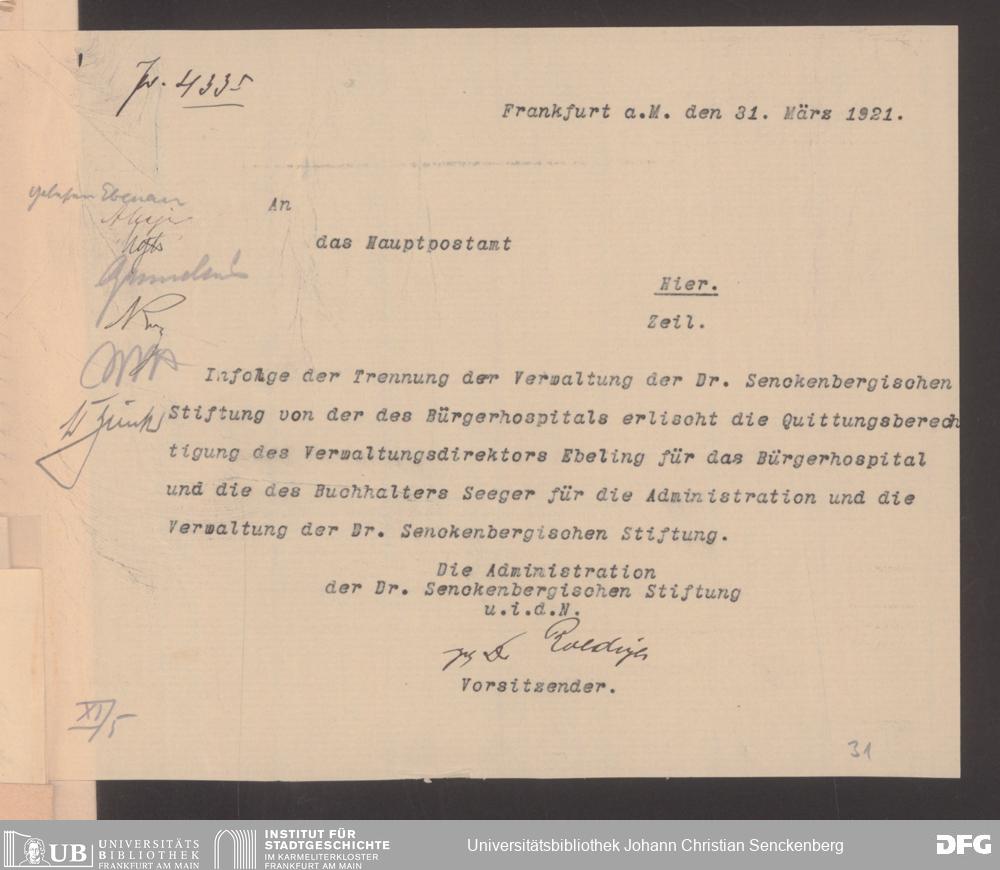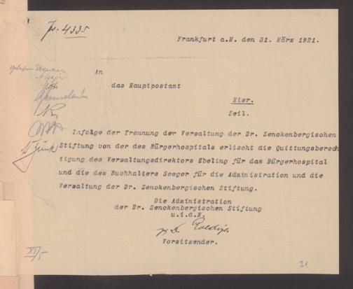 V48 Dr. Senckenbergische Stiftung, 489 - Postvollmachten der Senckenbergischen Institute