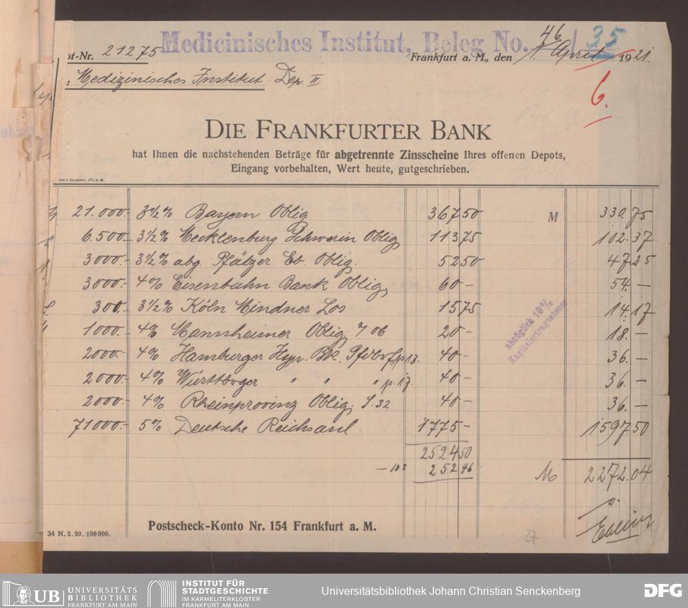 V48 Dr. Senckenbergische Stiftung, 498 - Belege über Einnahmen der Stiftungsverwaltung