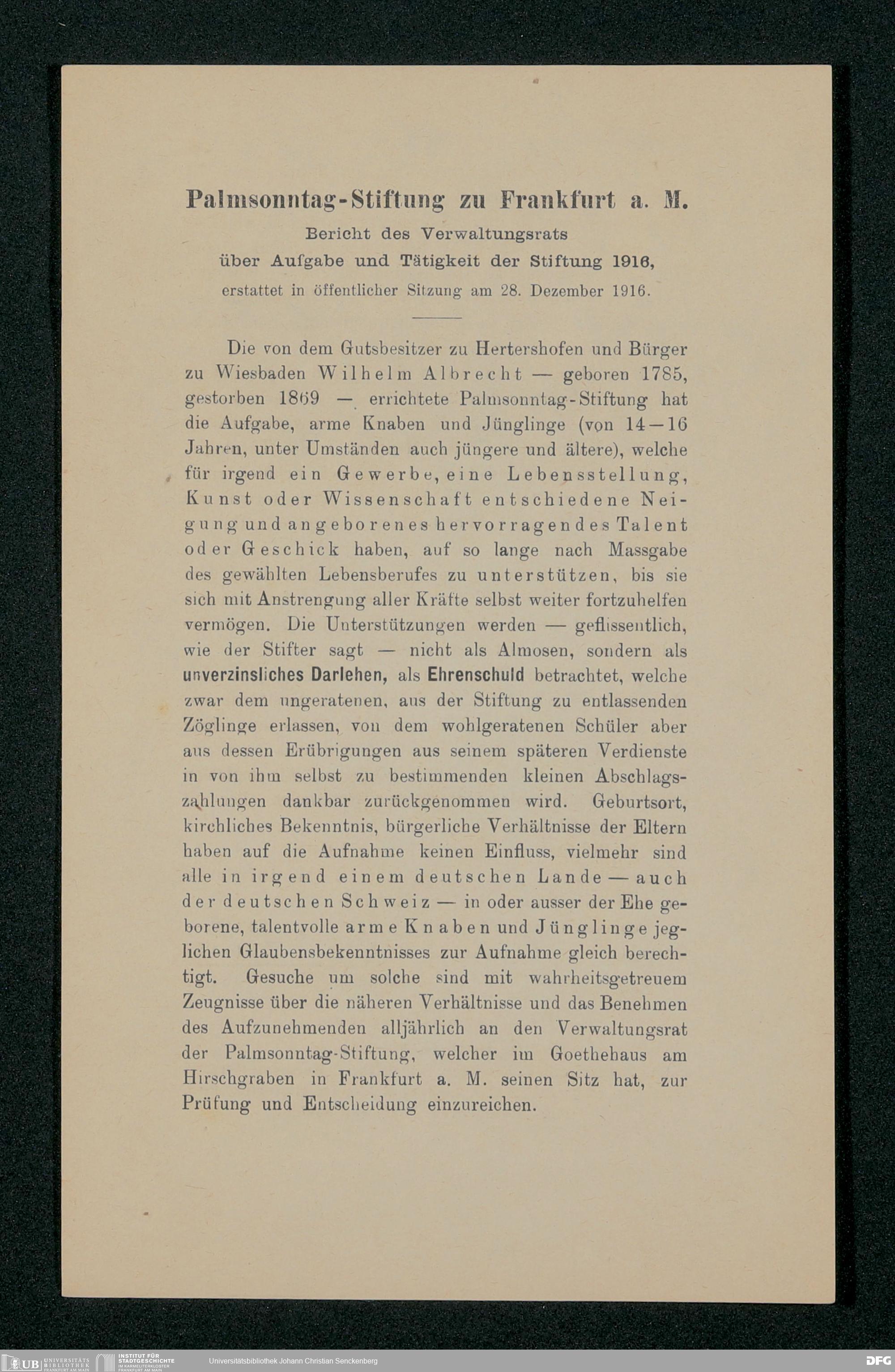 V48 Dr. Senckenbergische Stiftung, 517 - Berichte des Verwaltungsrates über Aufgabe und Tätigkeit der Palmsonntag-Stiftung 1890-1916