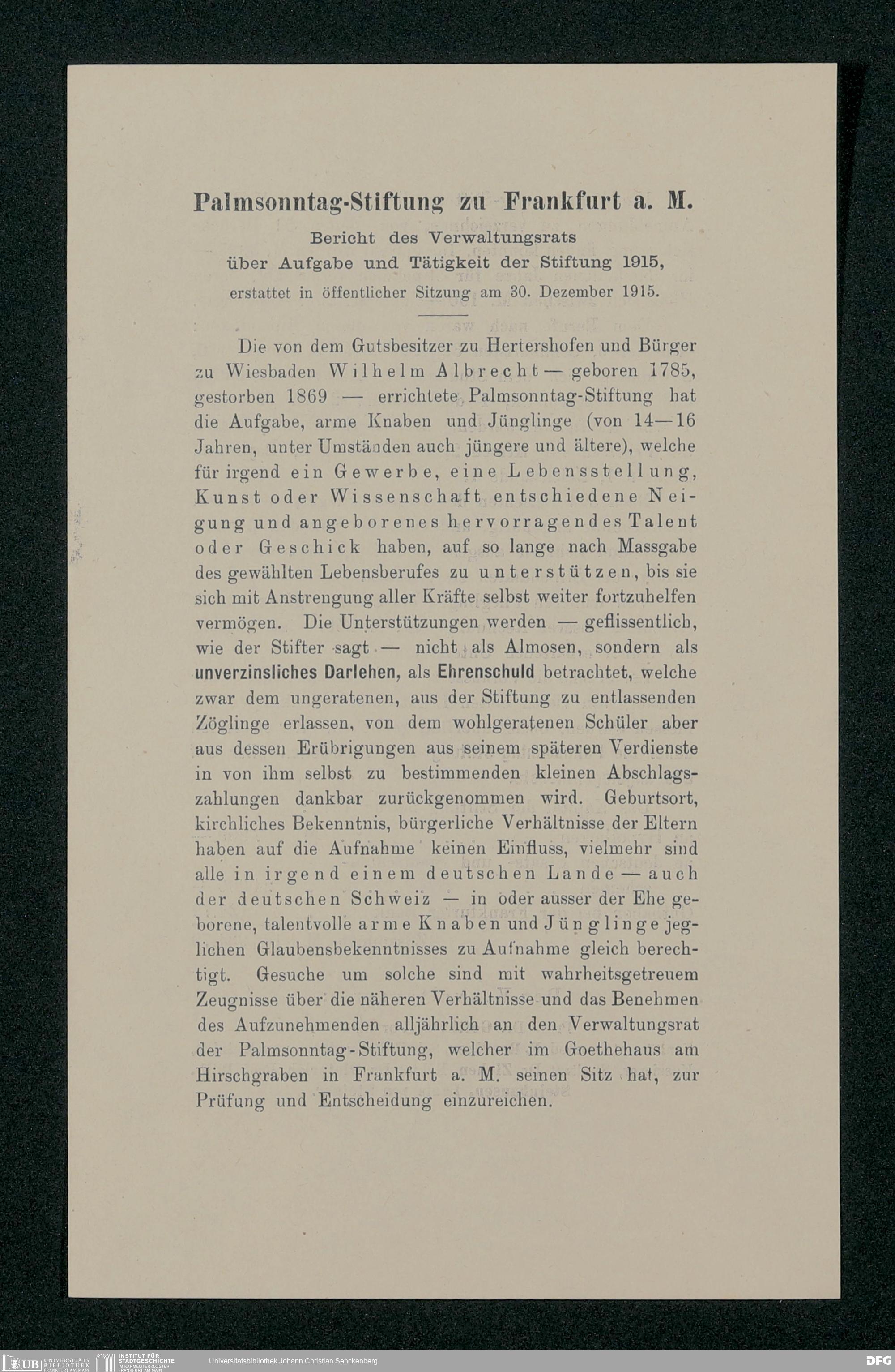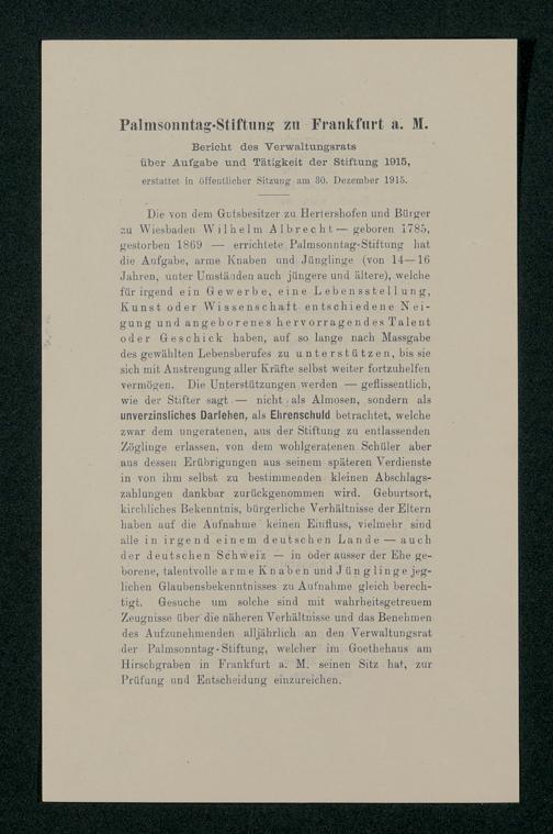 V48 Dr. Senckenbergische Stiftung, 517 - Berichte des Verwaltungsrates über Aufgabe und Tätigkeit der Palmsonntag-Stiftung 1890-1916