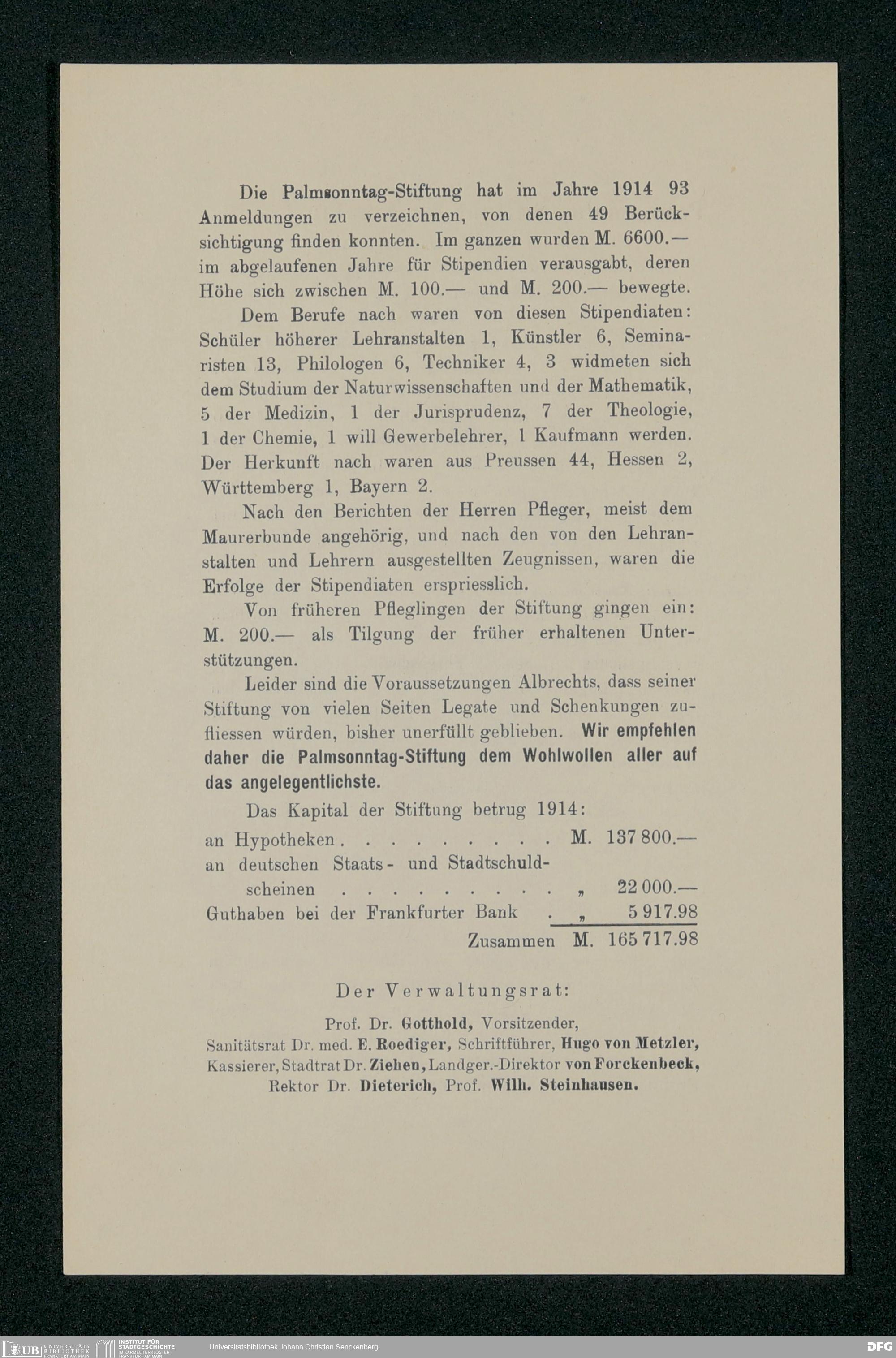 V48 Dr. Senckenbergische Stiftung, 517 - Berichte des Verwaltungsrates über Aufgabe und Tätigkeit der Palmsonntag-Stiftung 1890-1916