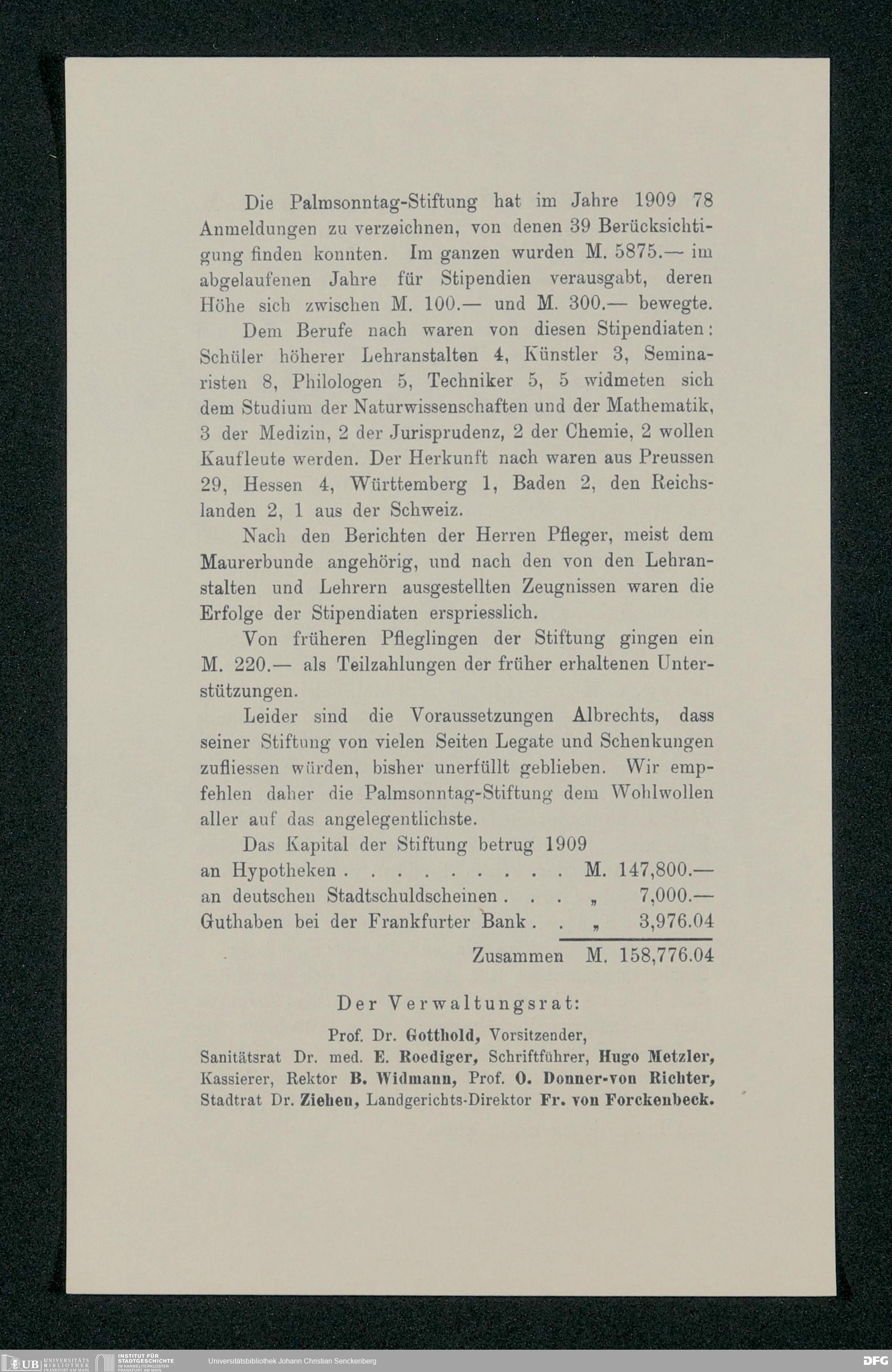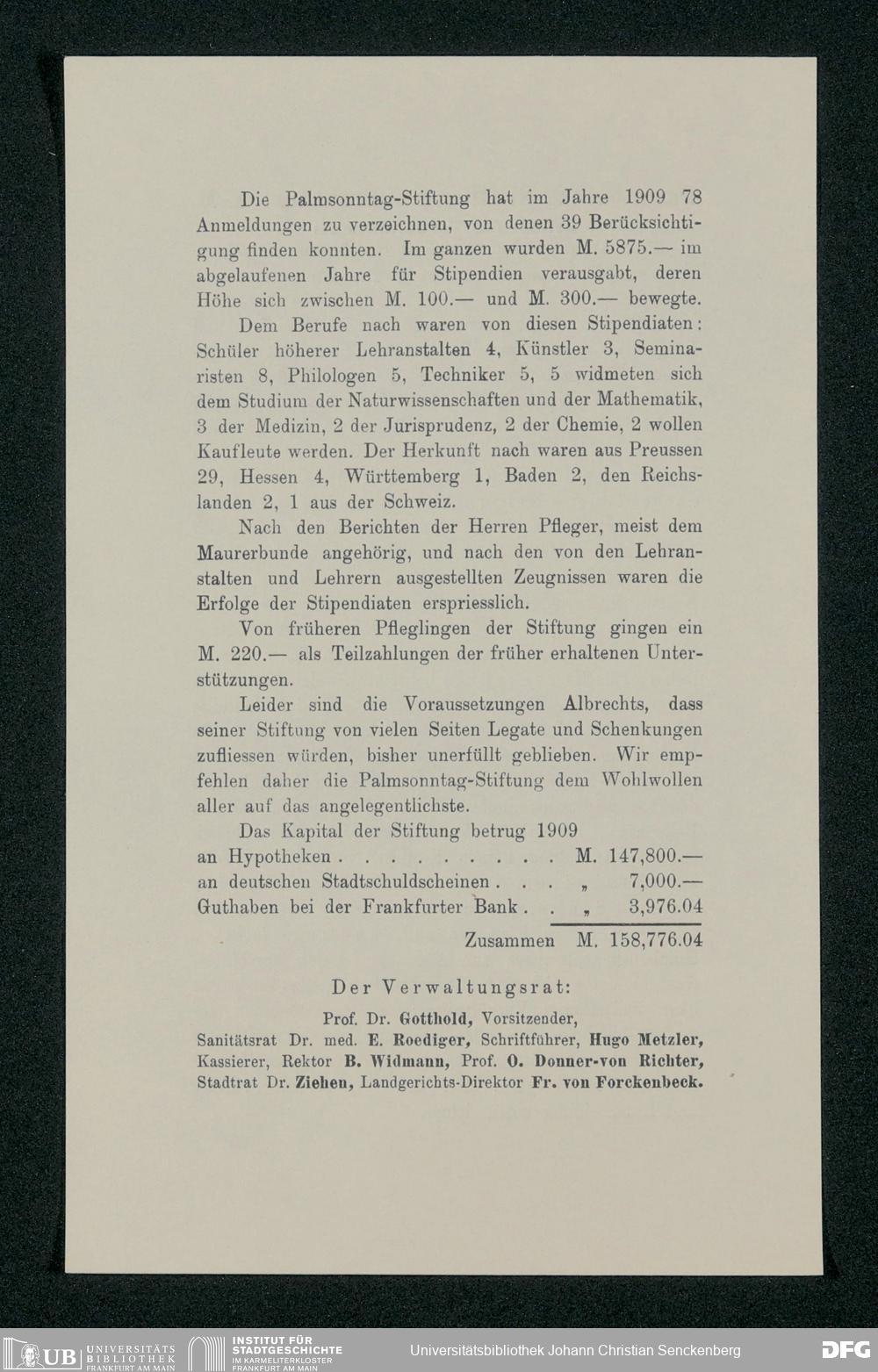 V48 Dr. Senckenbergische Stiftung, 517 - Berichte des Verwaltungsrates über Aufgabe und Tätigkeit der Palmsonntag-Stiftung 1890-1916