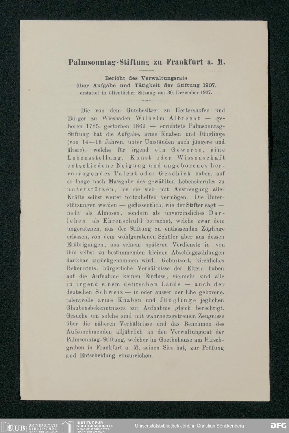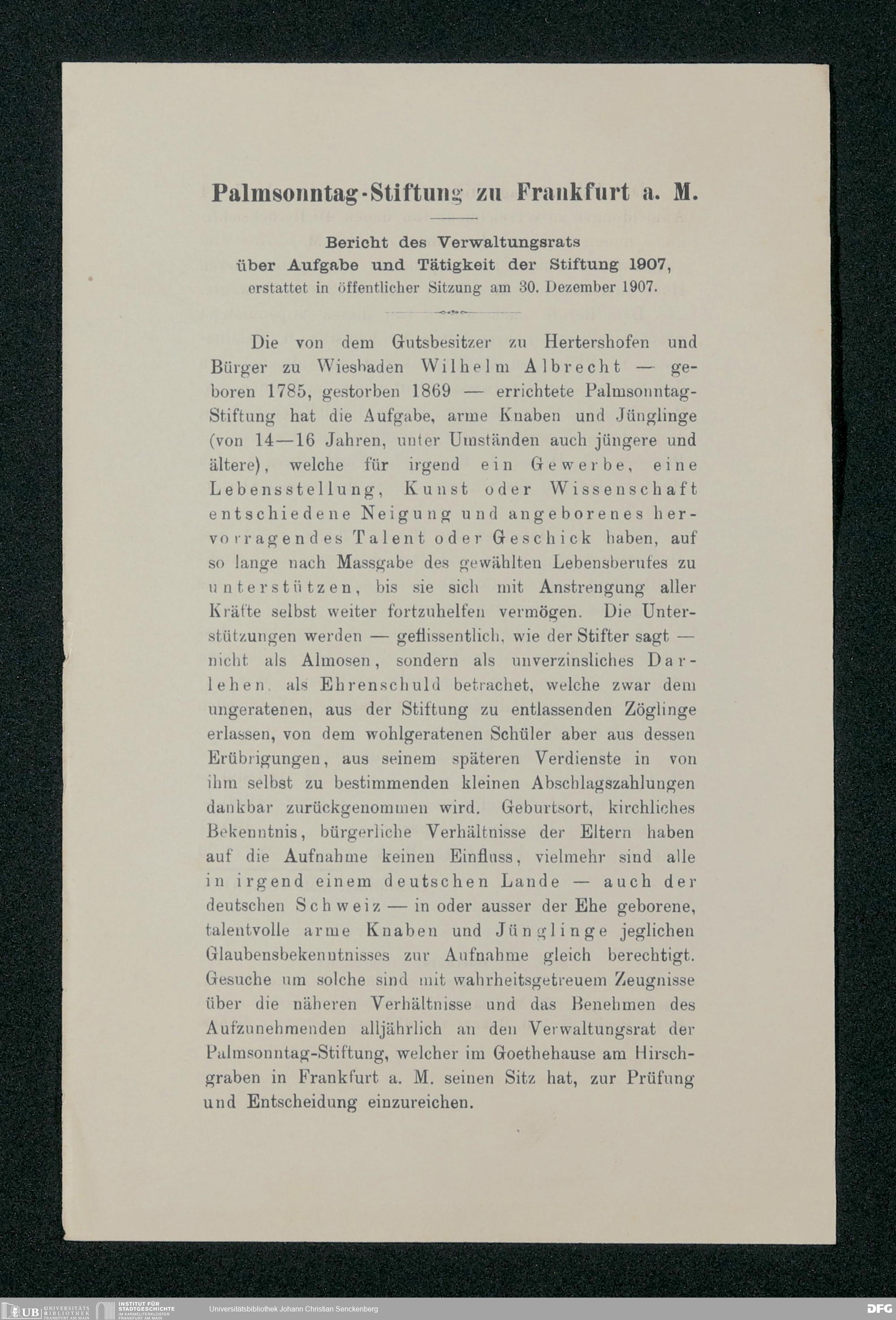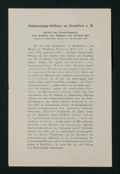 V48 Dr. Senckenbergische Stiftung, 517 - Berichte des Verwaltungsrates über Aufgabe und Tätigkeit der Palmsonntag-Stiftung 1890-1916