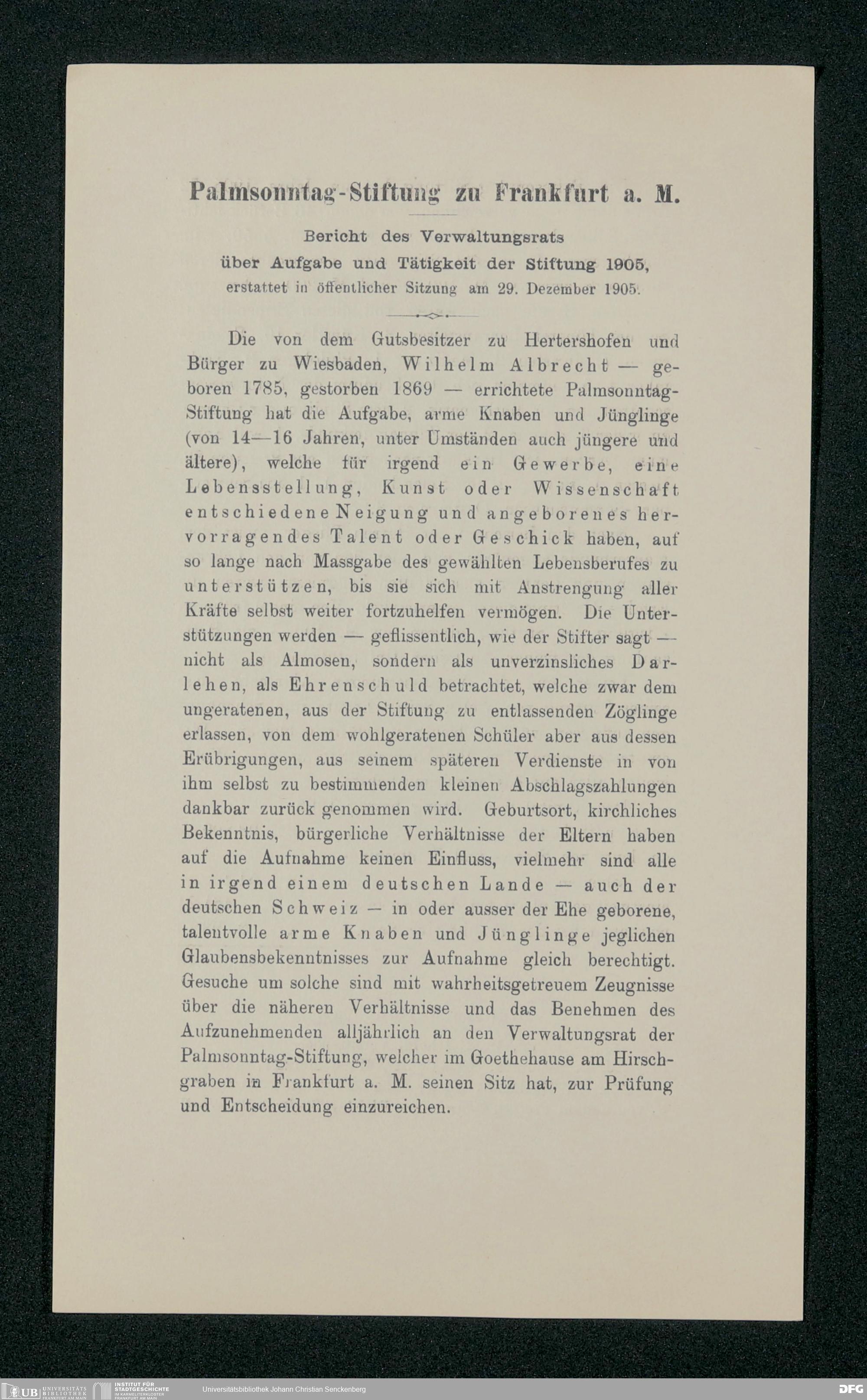 V48 Dr. Senckenbergische Stiftung, 517 - Berichte des Verwaltungsrates über Aufgabe und Tätigkeit der Palmsonntag-Stiftung 1890-1916