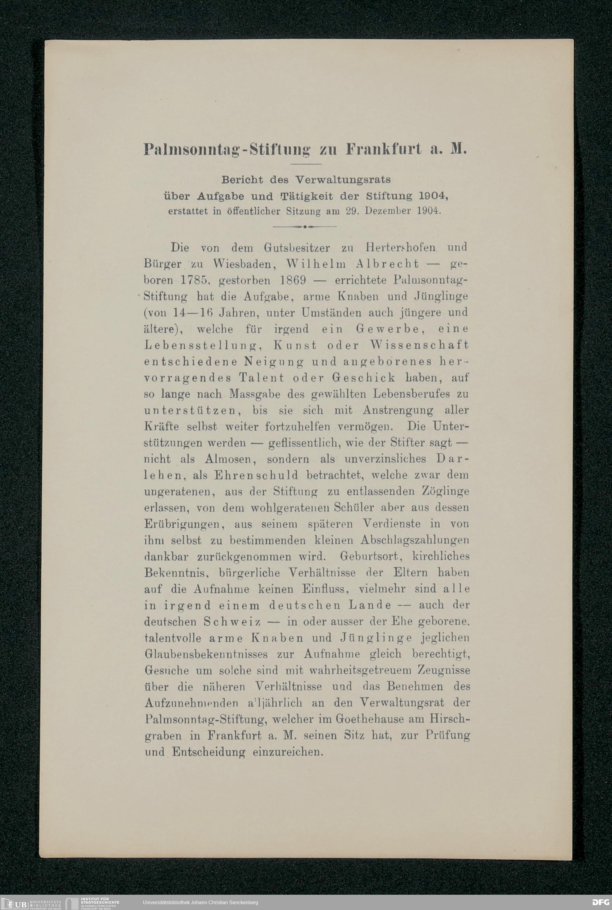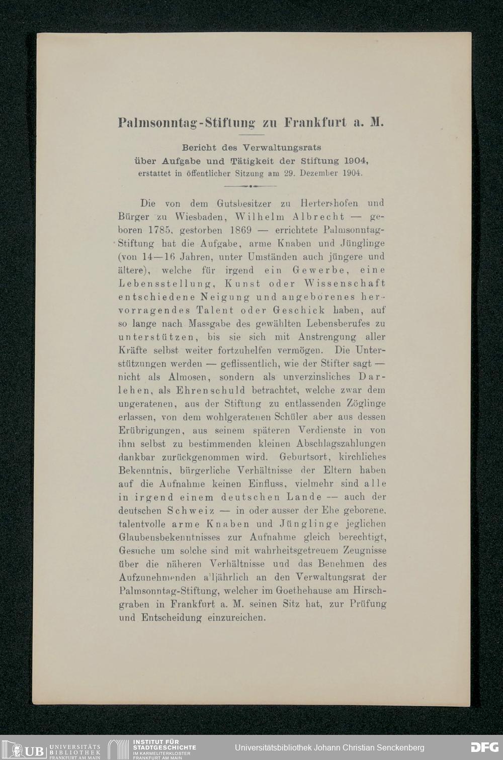 V48 Dr. Senckenbergische Stiftung, 517 - Berichte des Verwaltungsrates über Aufgabe und Tätigkeit der Palmsonntag-Stiftung 1890-1916