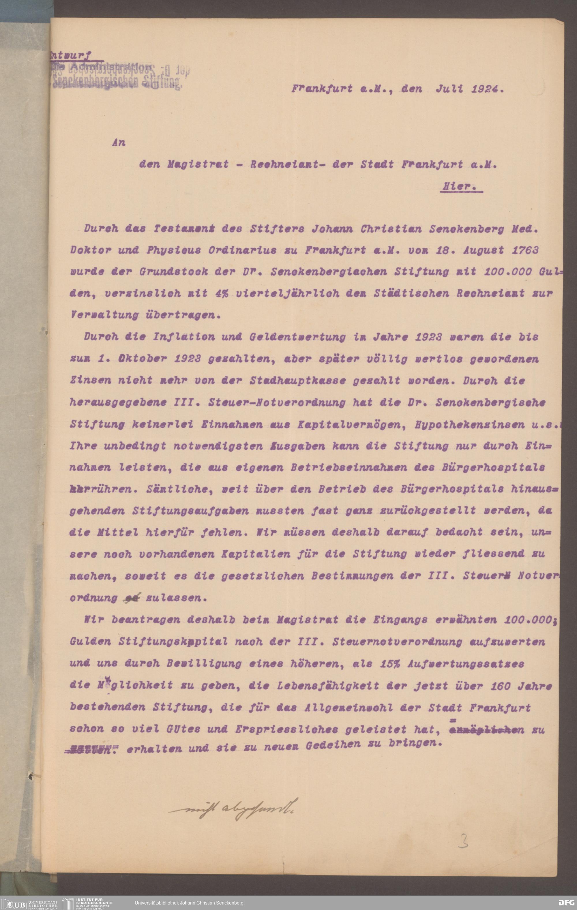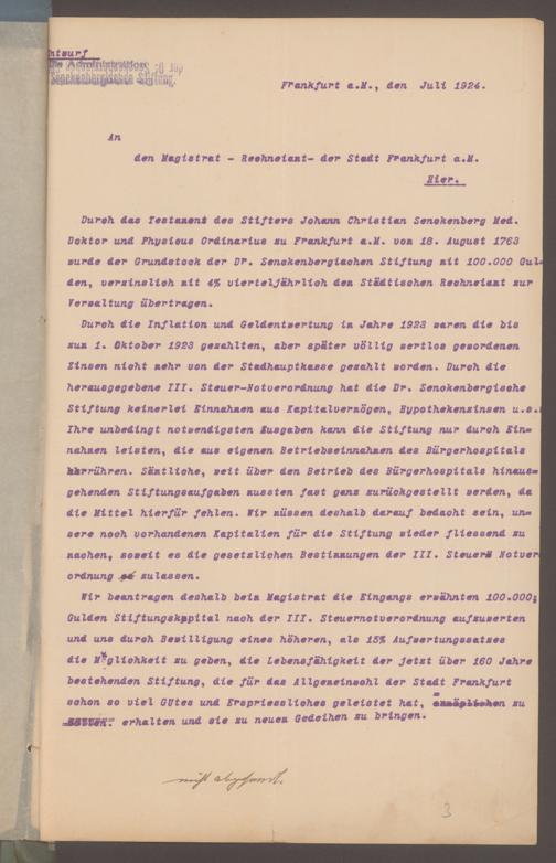 V48 Dr. Senckenbergische Stiftung, 529 - Umgang mit dem von Johann Christian Senckenberg im Jahr 1763 beim Rechneiamt hinterlegten Kapital
