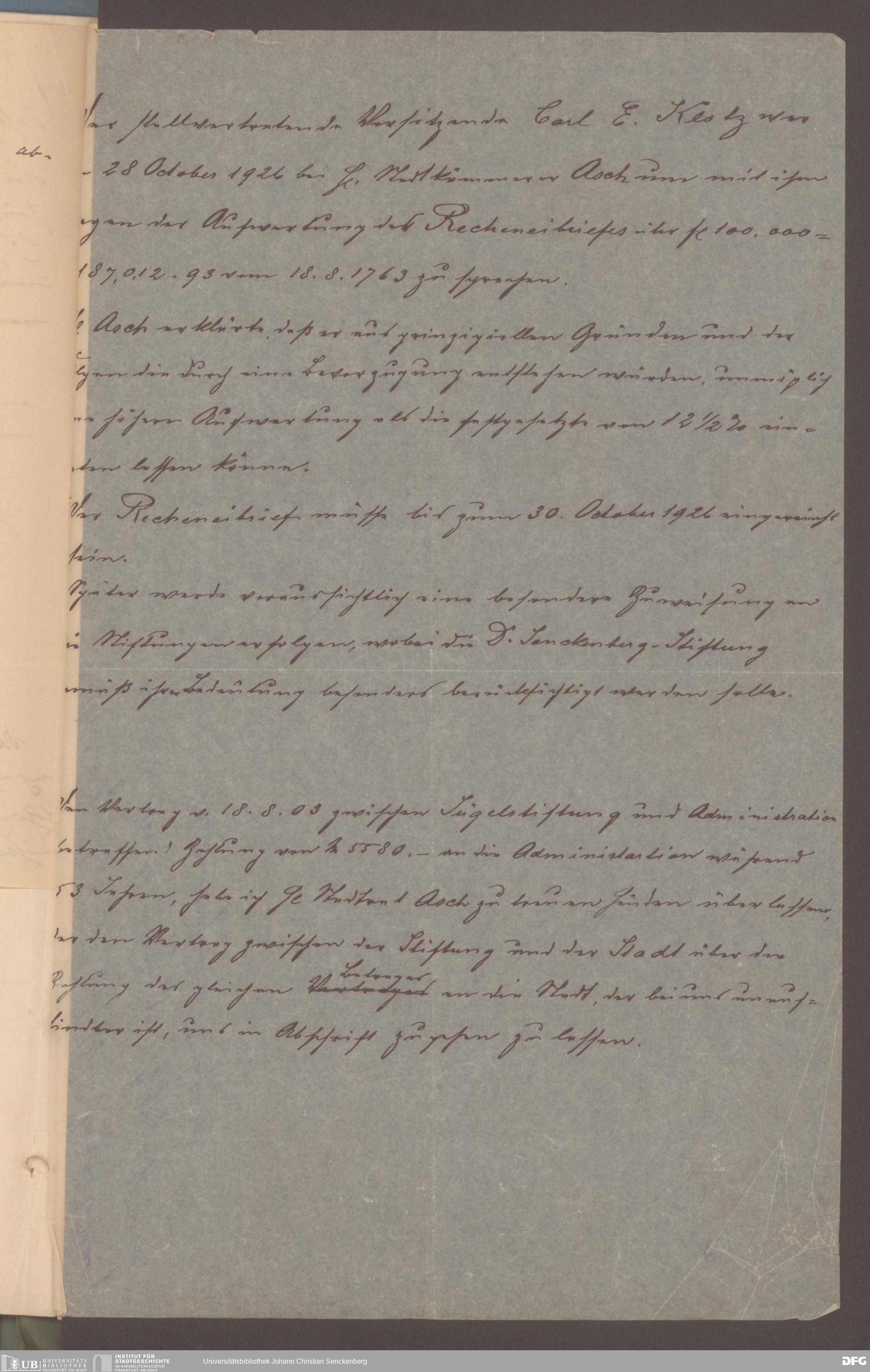 V48 Dr. Senckenbergische Stiftung, 529 - Umgang mit dem von Johann Christian Senckenberg im Jahr 1763 beim Rechneiamt hinterlegten Kapital