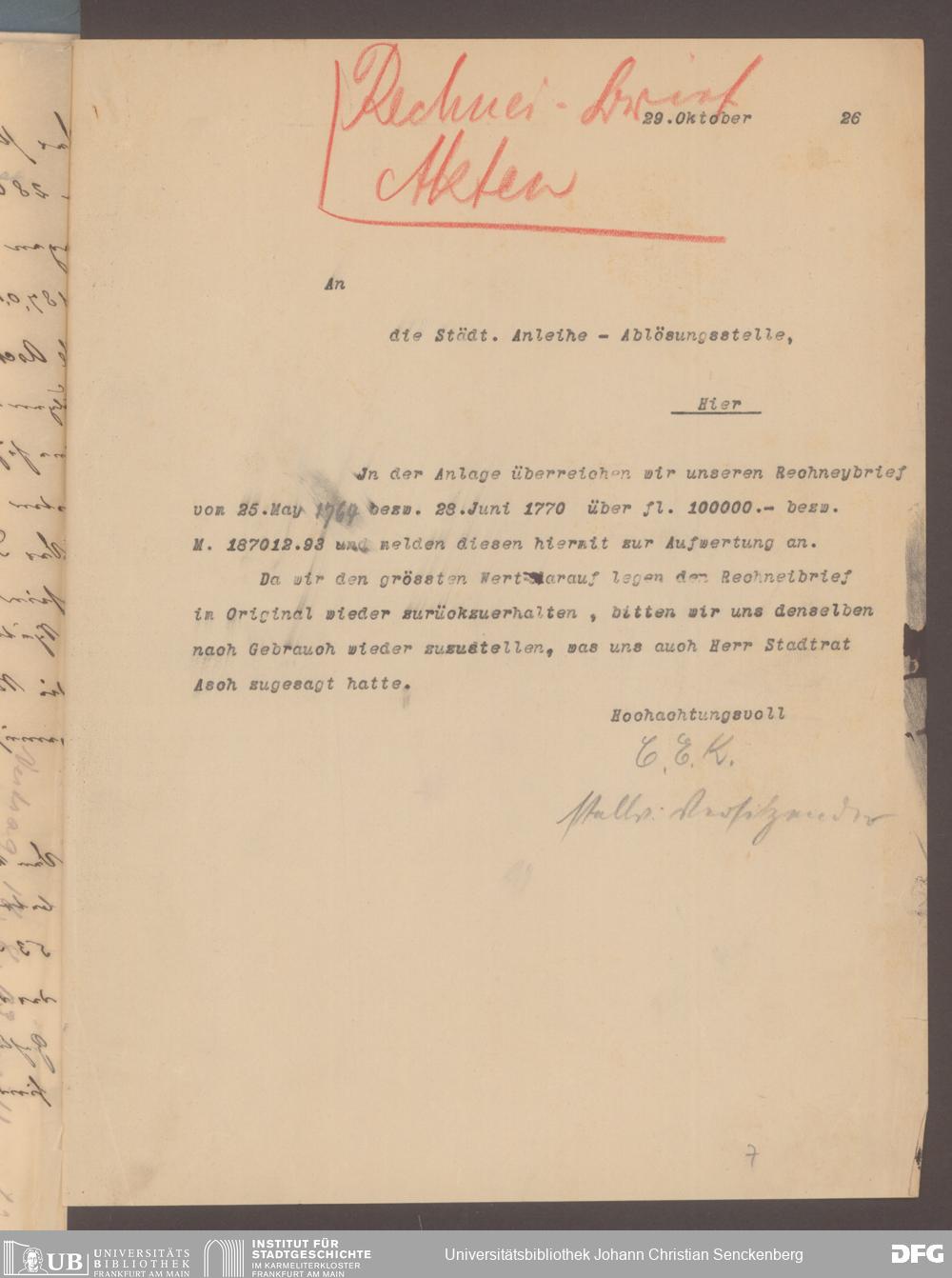 V48 Dr. Senckenbergische Stiftung, 529 - Umgang mit dem von Johann Christian Senckenberg im Jahr 1763 beim Rechneiamt hinterlegten Kapital