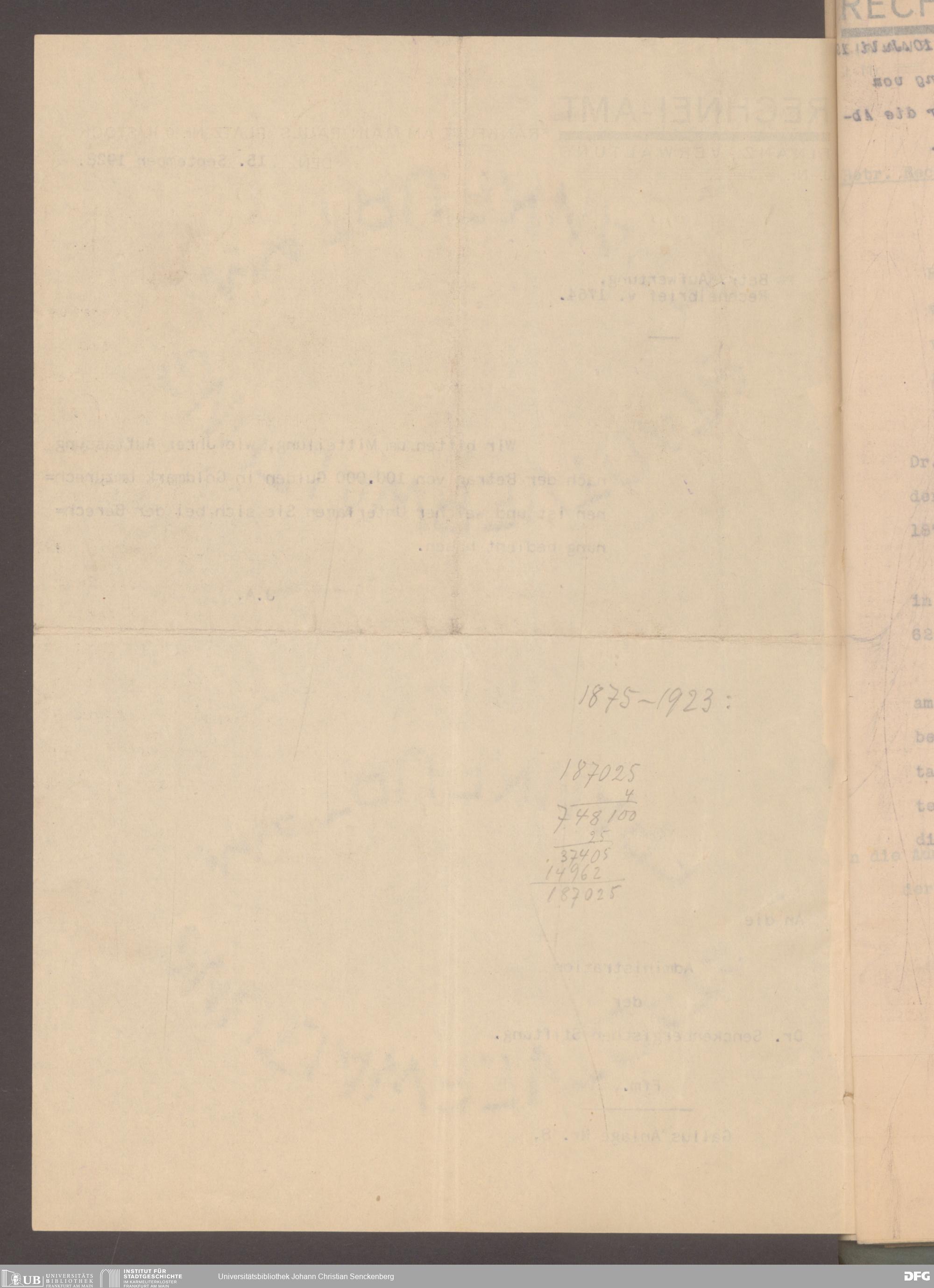 V48 Dr. Senckenbergische Stiftung, 529 - Umgang mit dem von Johann Christian Senckenberg im Jahr 1763 beim Rechneiamt hinterlegten Kapital