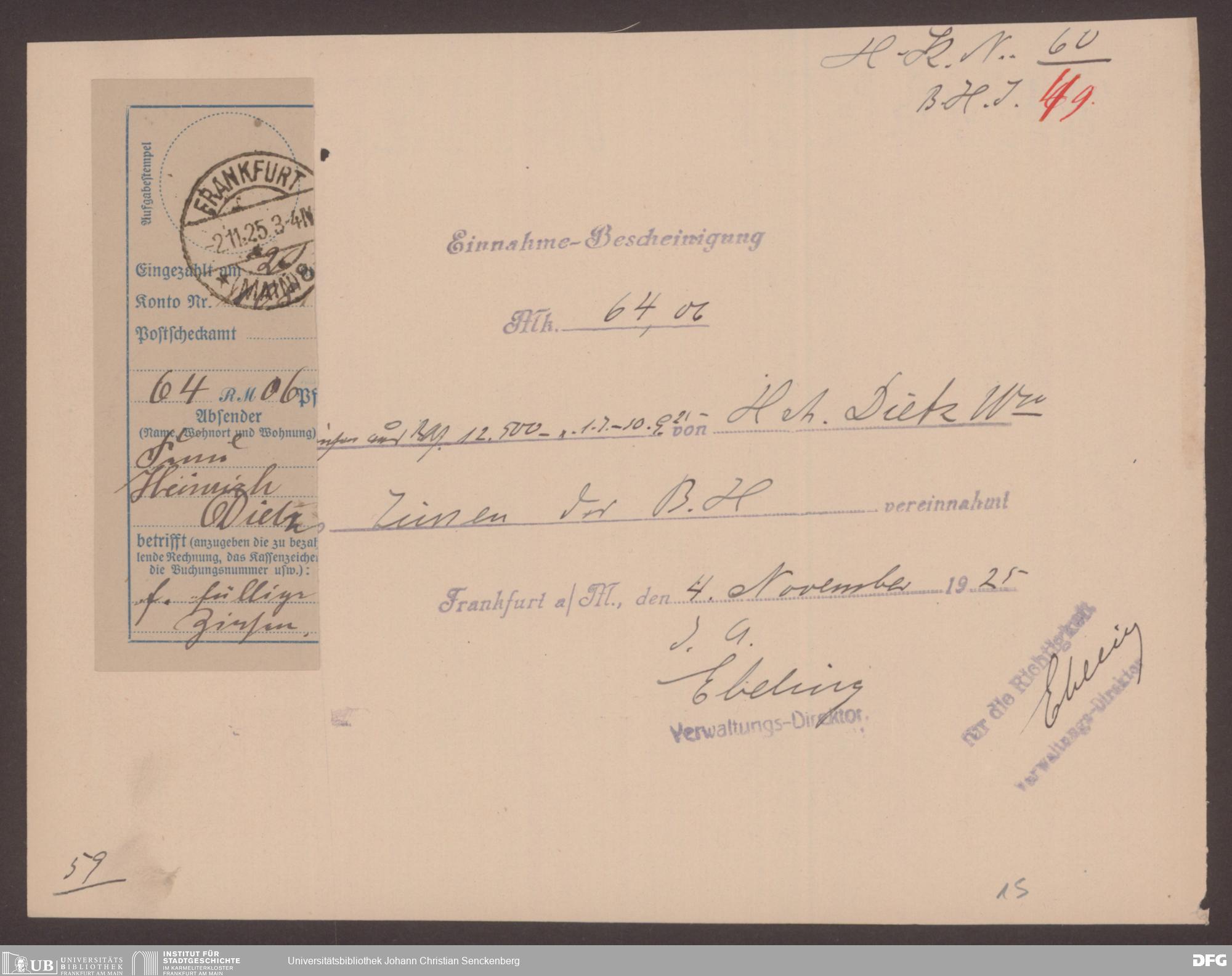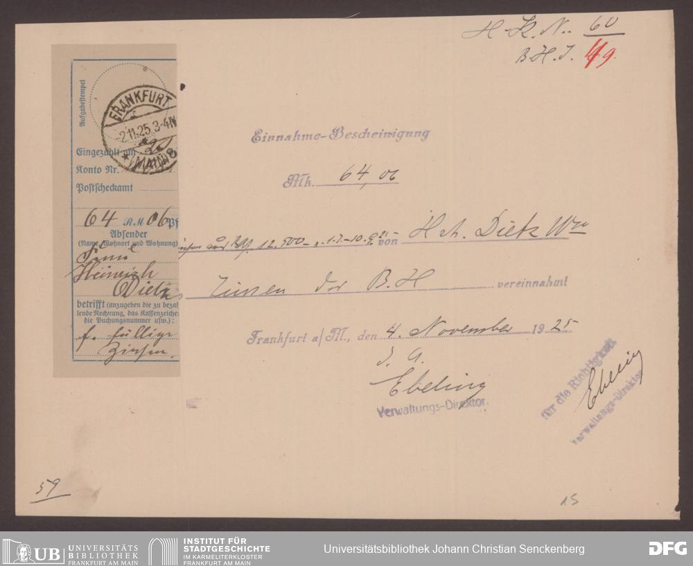 V48 Dr. Senckenbergische Stiftung, 555 - Belege über Einnahmen der Stiftung