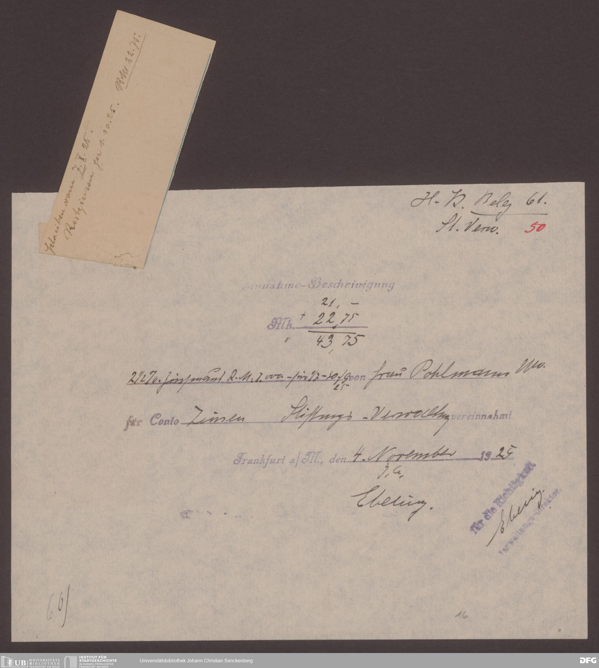 V48 Dr. Senckenbergische Stiftung, 555 - Belege über Einnahmen der Stiftung