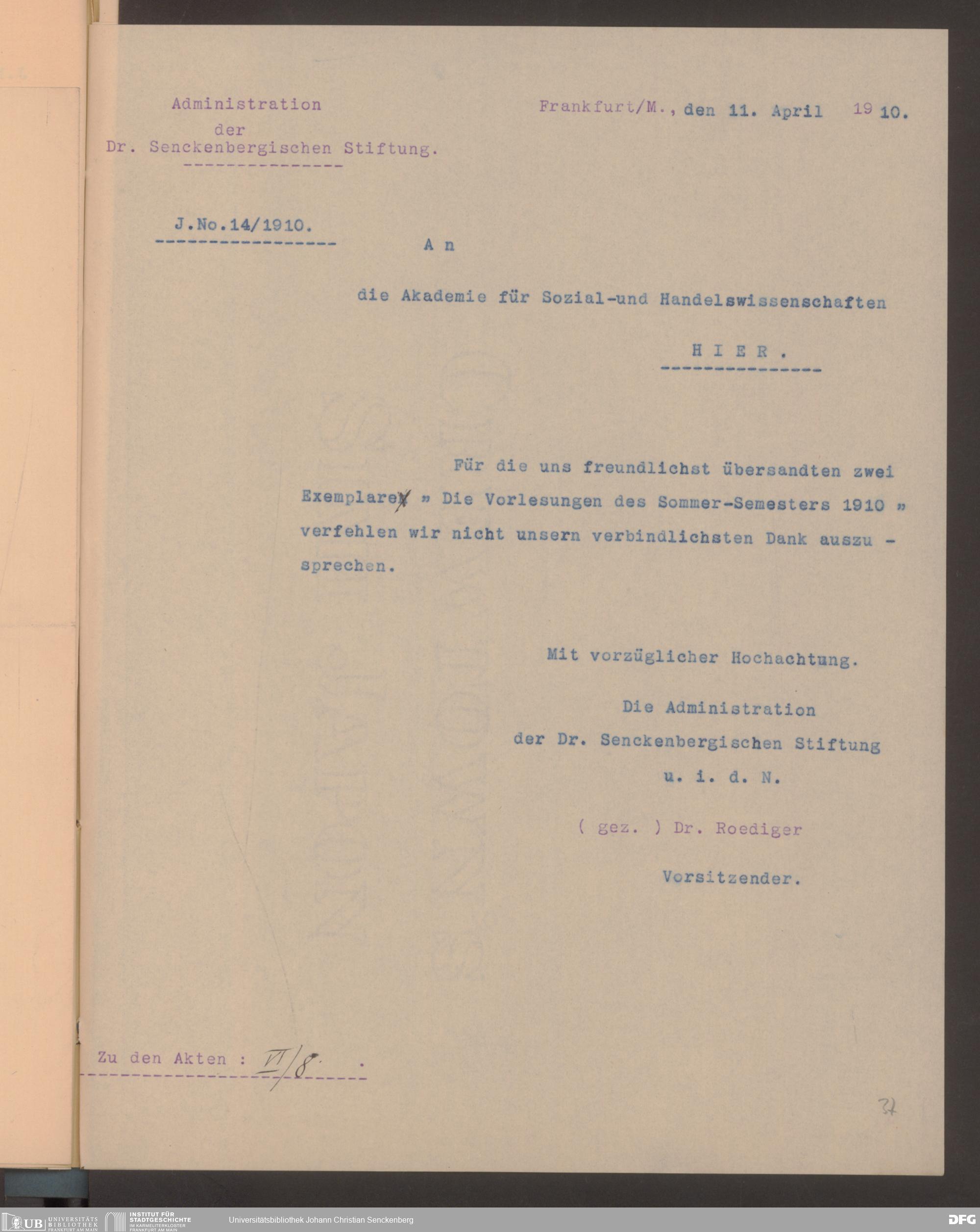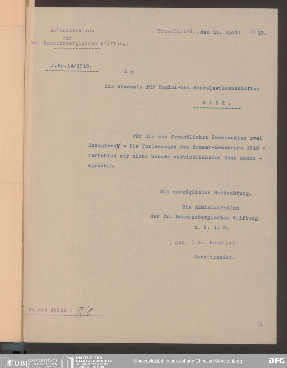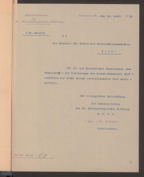 V48 Dr. Senckenbergische Stiftung, 628 - Beziehungen zur Akademie für Sozial- und Handelswissenschaften