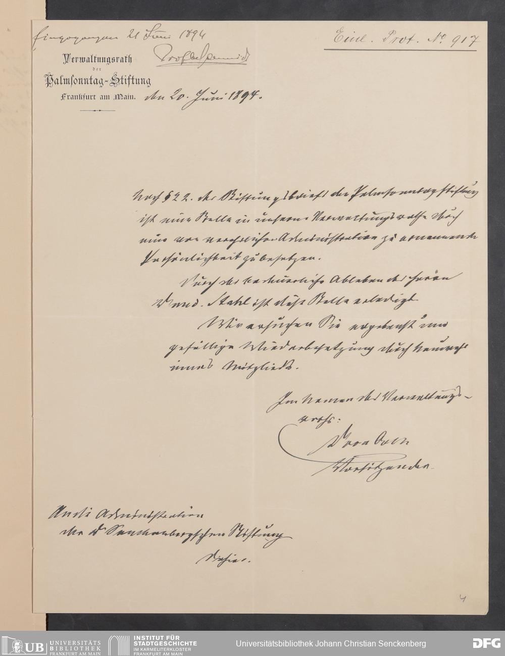 V48 Dr. Senckenbergische Stiftung, 743 - Ernennung Carl Stahls zum Deputierten der Senckenbergischen Stiftung bei der Palmsonntag-Stiftung