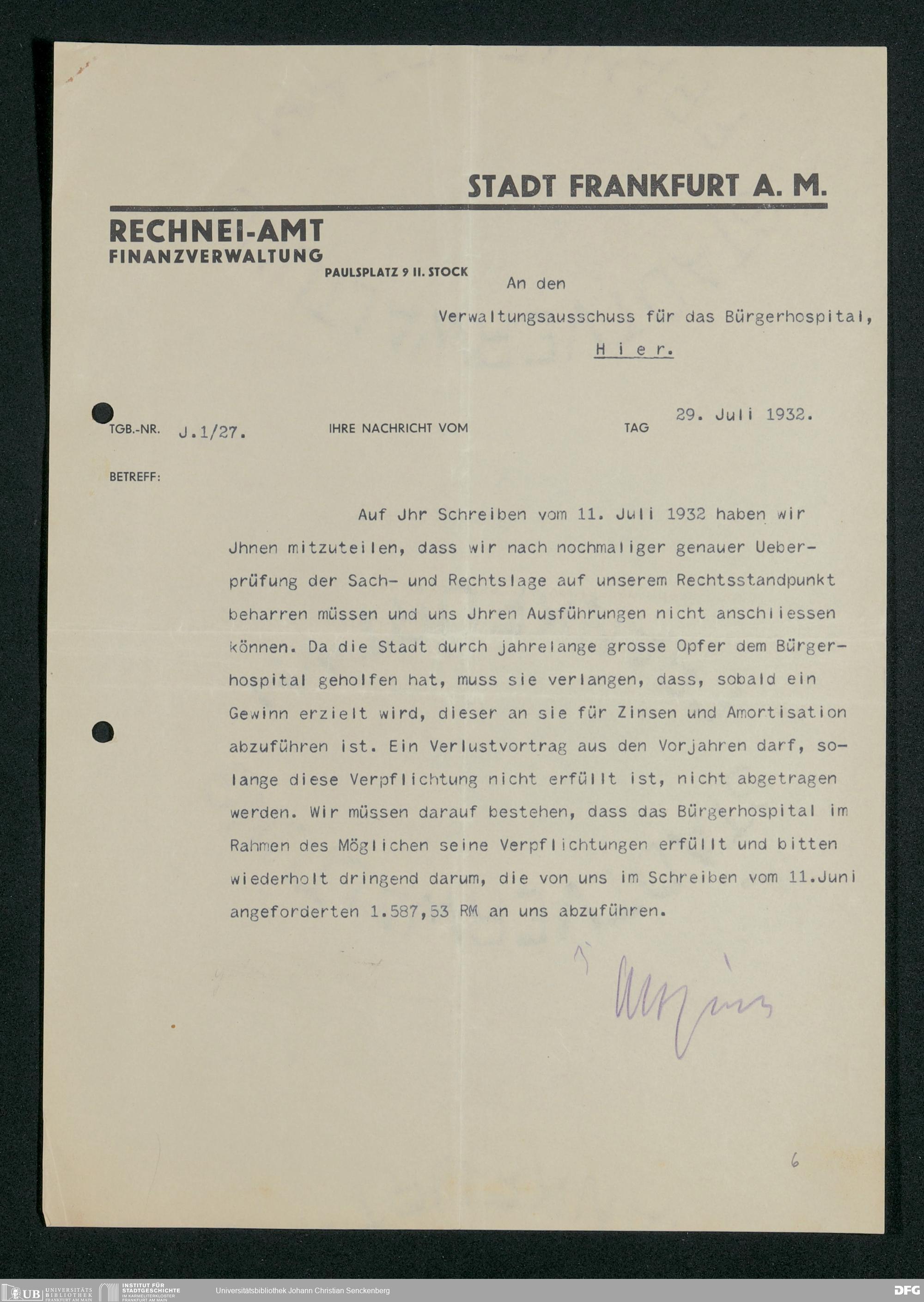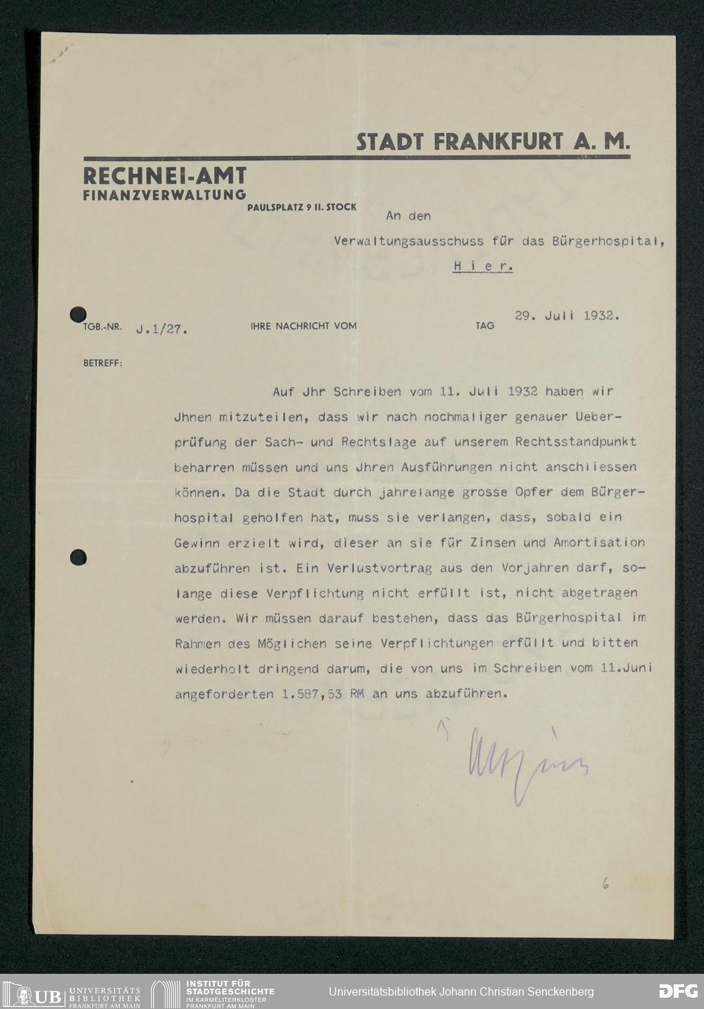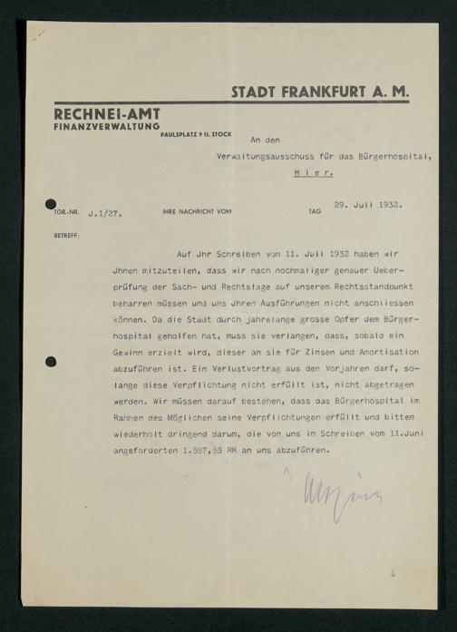 V48 Dr. Senckenbergische Stiftung, 748 - Korrespondenz zwischen der Administration und dem Rechneiamt über Zinsen und Tilgung eines von der Stadt dem Bürgerhospital gewährten Darlehens