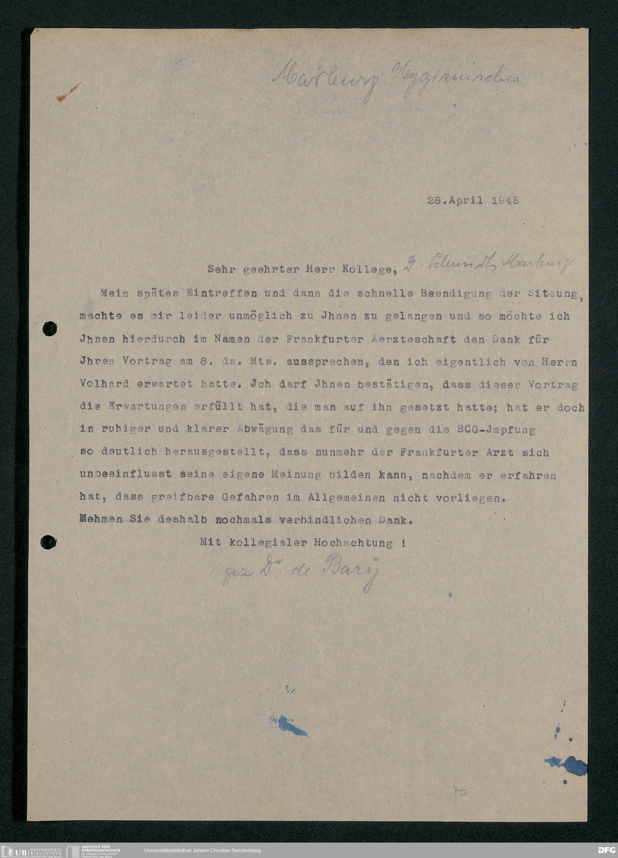 V48 Dr. Senckenbergische Stiftung, 778 - Handakten August de Barys