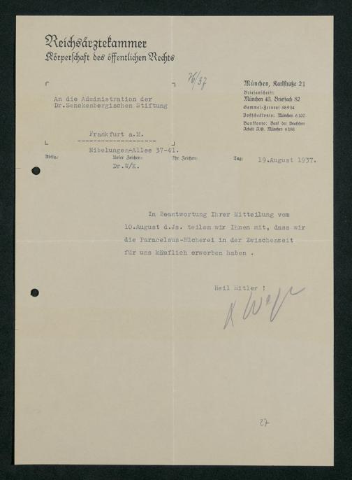 V48 Dr. Senckenbergische Stiftung, 782 - Ankauf der Bibliothek von Dr. Alfons Fischer durch die Senckenbergische Stiftung