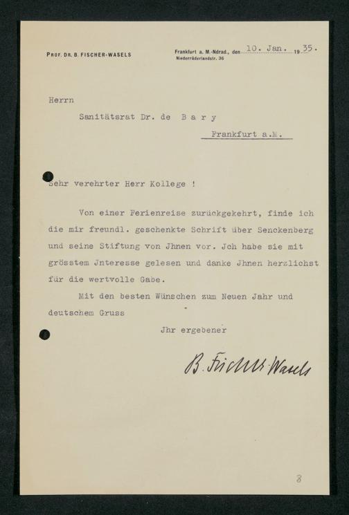 V48 Dr. Senckenbergische Stiftung, 790 - Dankschreiben an die Administration für erhaltene Freiexemplare der von August de Bary verfassten Biografie Johann Christian Senckenbergs