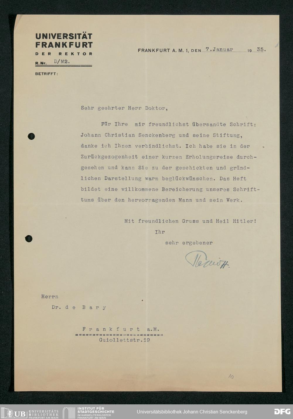 V48 Dr. Senckenbergische Stiftung, 790 - Dankschreiben an die Administration für erhaltene Freiexemplare der von August de Bary verfassten Biografie Johann Christian Senckenbergs