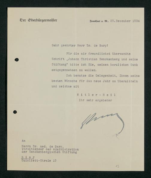 V48 Dr. Senckenbergische Stiftung, 790 - Dankschreiben an die Administration für erhaltene Freiexemplare der von August de Bary verfassten Biografie Johann Christian Senckenbergs