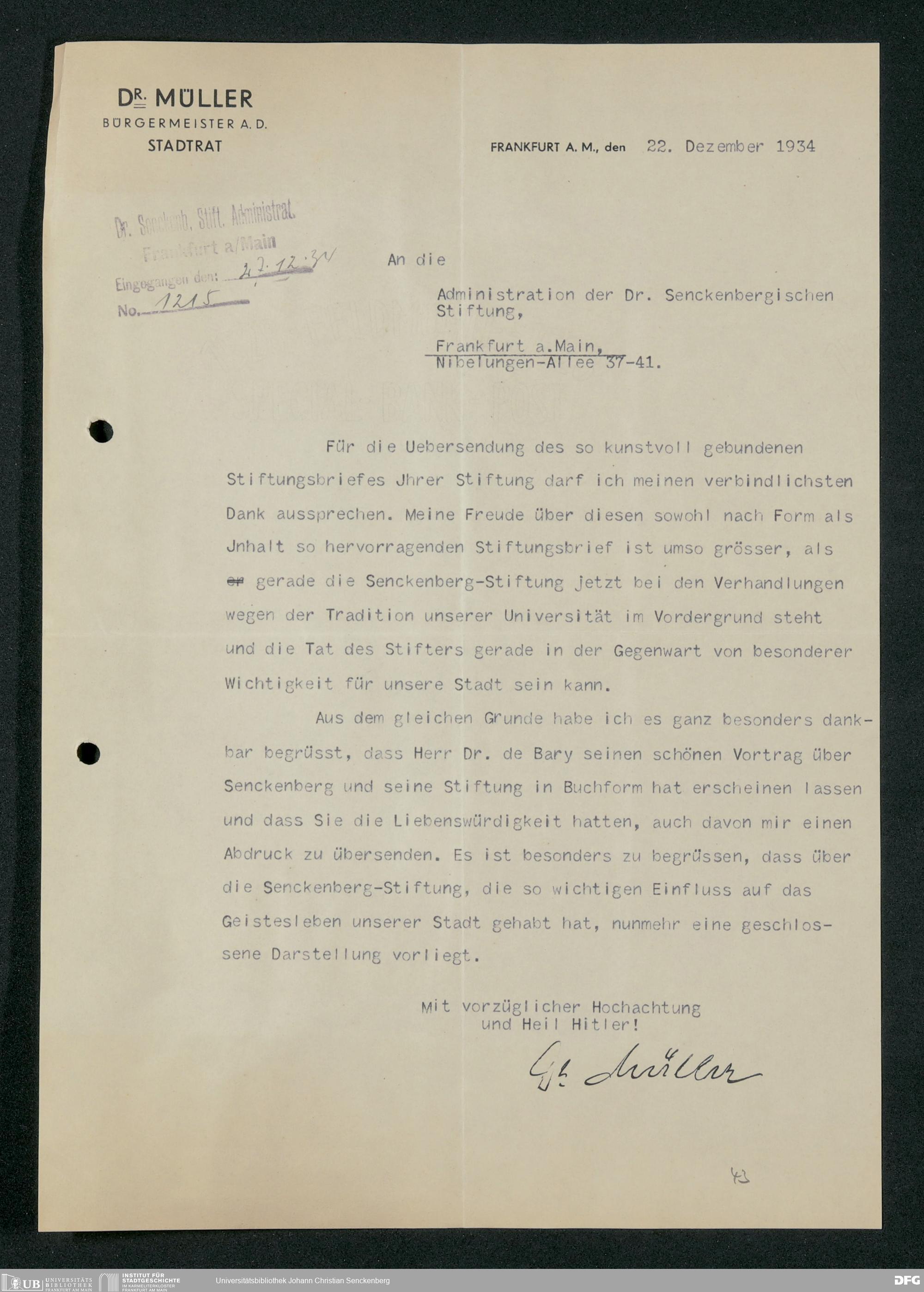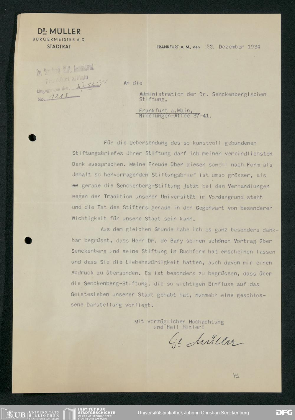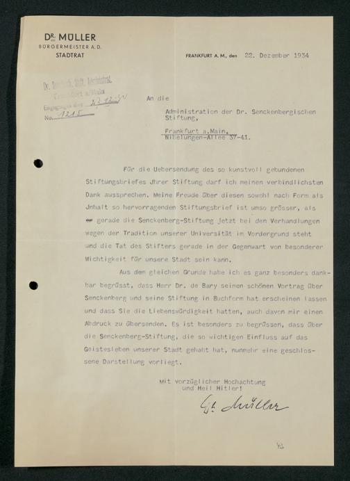 V48 Dr. Senckenbergische Stiftung, 790 - Dankschreiben an die Administration für erhaltene Freiexemplare der von August de Bary verfassten Biografie Johann Christian Senckenbergs