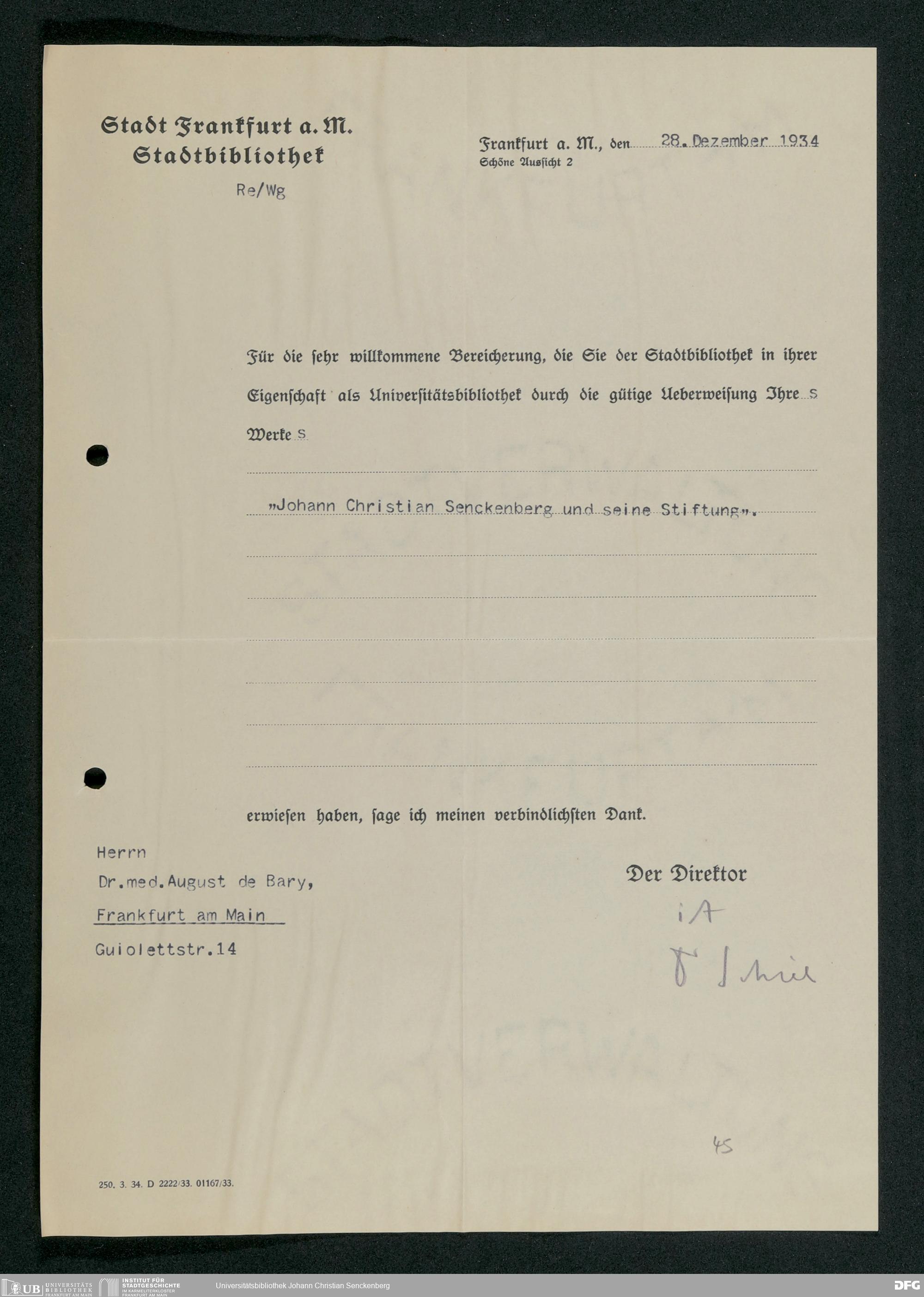 V48 Dr. Senckenbergische Stiftung, 790 - Dankschreiben an die Administration für erhaltene Freiexemplare der von August de Bary verfassten Biografie Johann Christian Senckenbergs