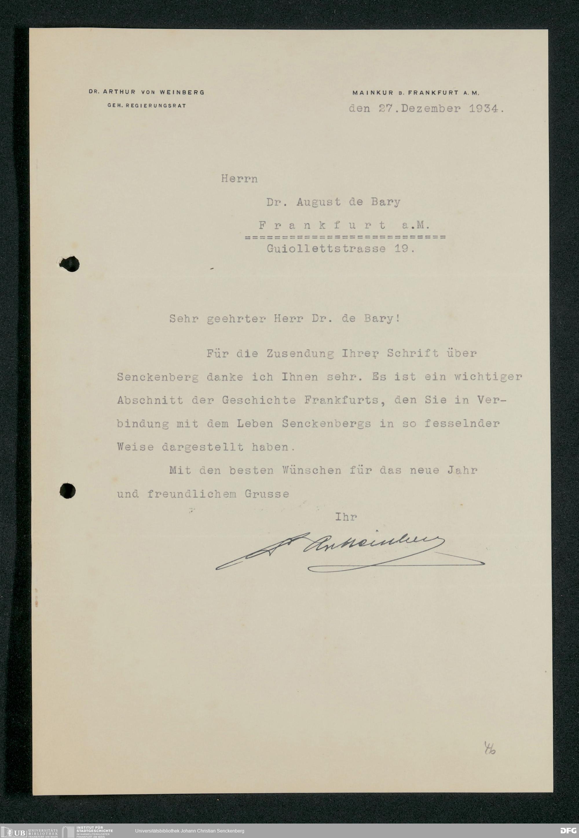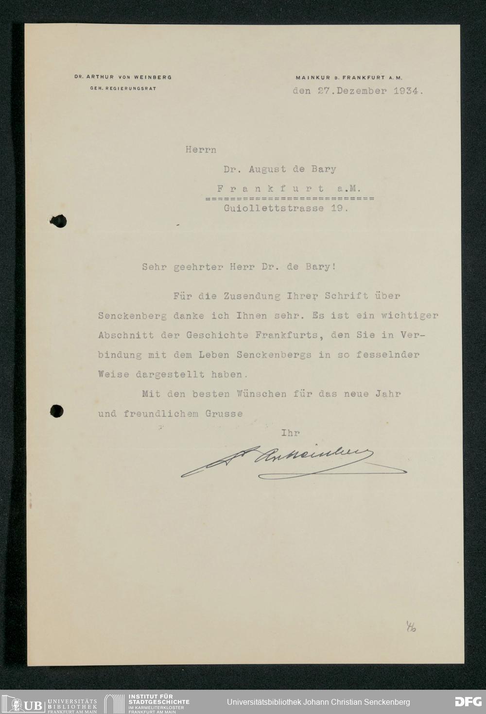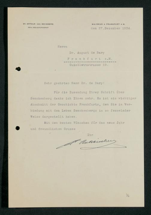 V48 Dr. Senckenbergische Stiftung, 790 - Dankschreiben an die Administration für erhaltene Freiexemplare der von August de Bary verfassten Biografie Johann Christian Senckenbergs